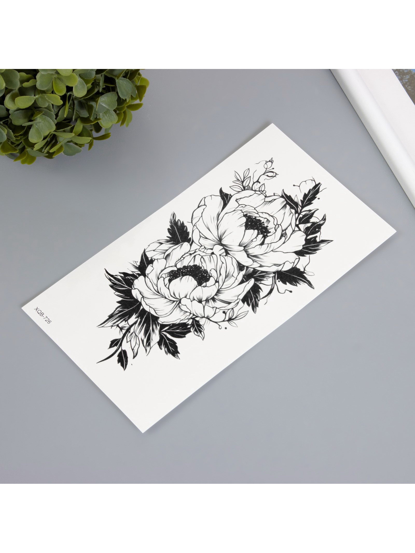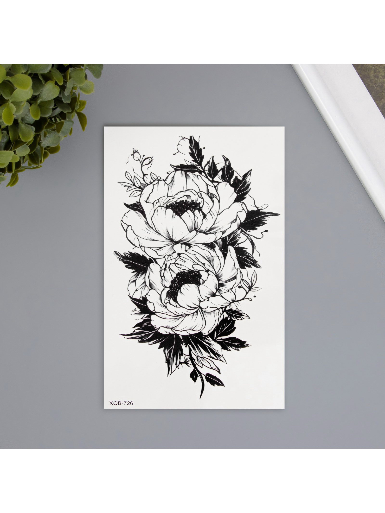 Переводная тату на тело чёрная "Пионы чёрно-белые", 11.4x21 см, 11.4x21 см., Китай