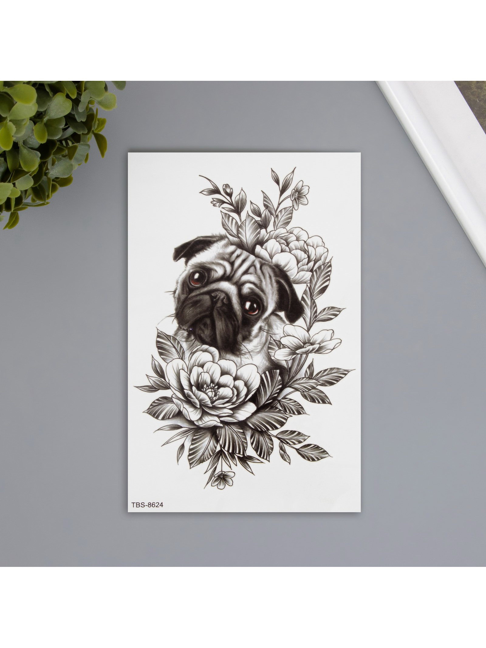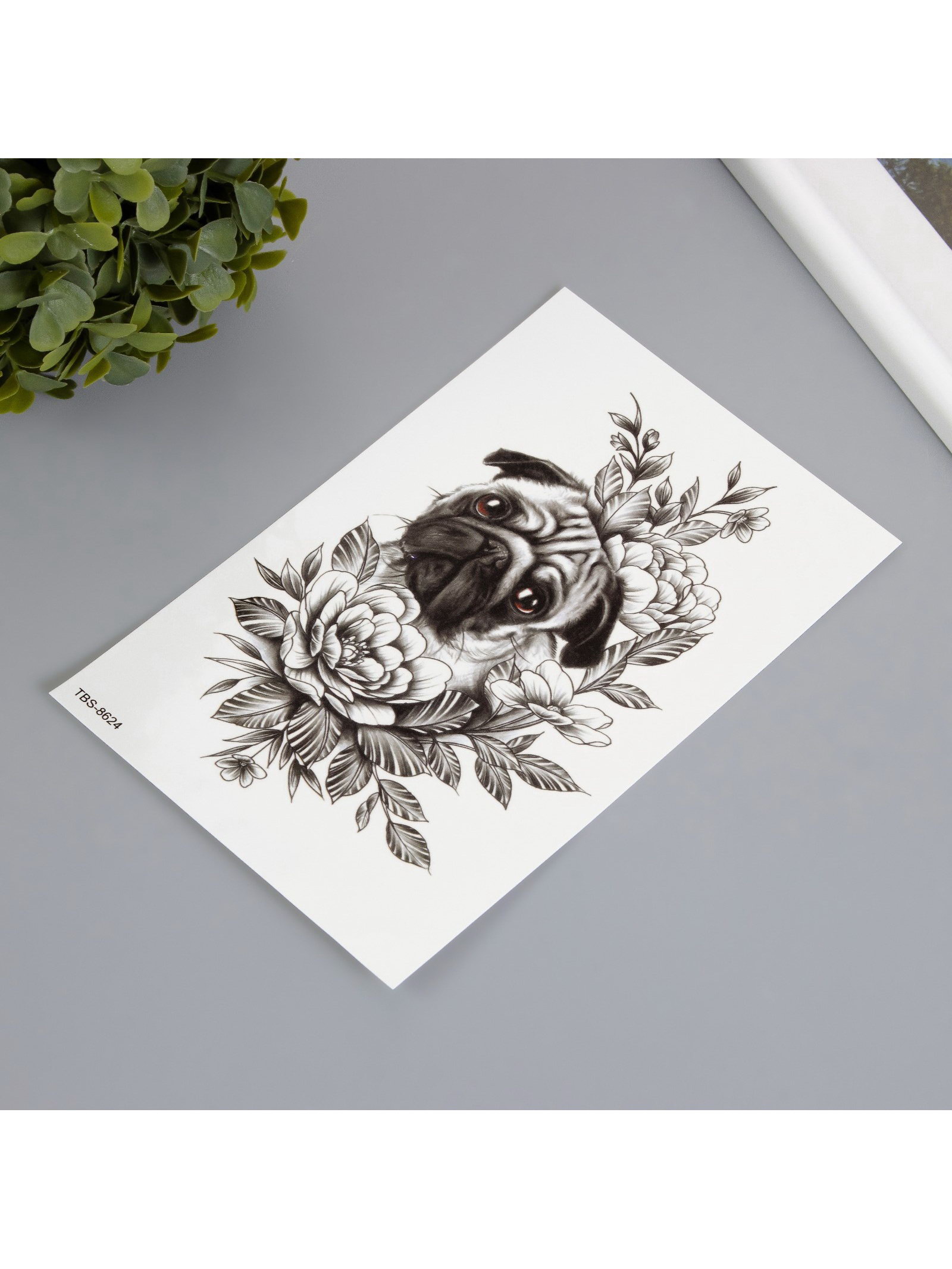 Переводная тату на тело цветная "Мопс в цветах", 12x19 см, 12x19 см., Китай