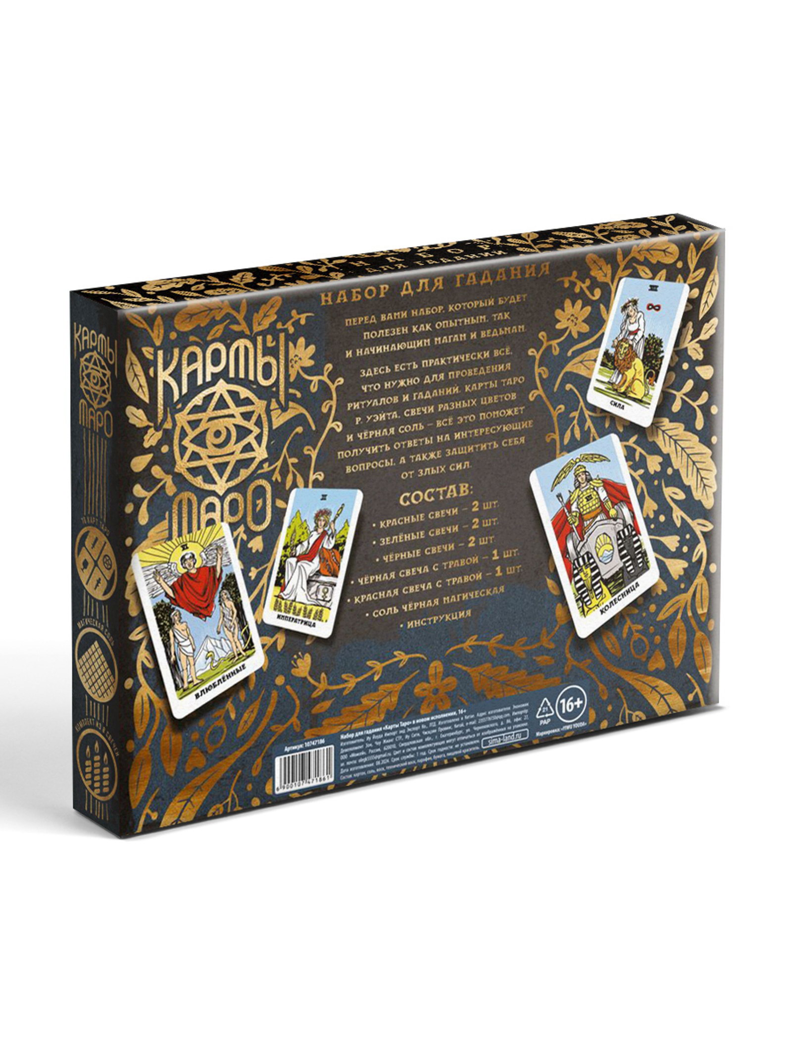 Вид: Свечи, Таро Размер упаковки: 23 x 17 x 3 см. tnved: 9504400000 Количество карточек: 78 Для кого: Унисекс Количество игроков: От 1 игрока Возрастная категория: 16+ Возраст: От 16 лет Время игры: 20 минут | ||