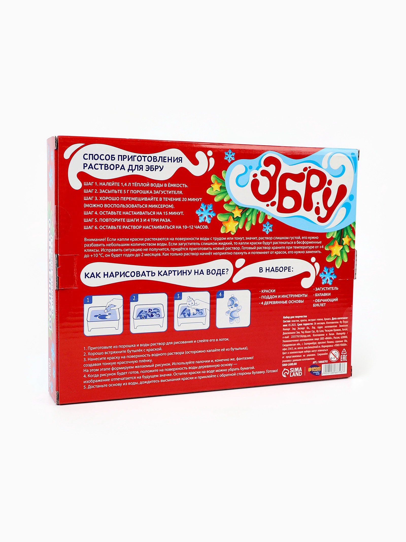 Вид: Загустители, Инструменты, Краска, Лотки, Эбру Возраст: Детский, Для детей, От 4 лет Размер упаковки: 4 x 20 x 26 см. tnved: 7117900000 Набор: Да Символ года: Символ года 2026 (Лошадь) Тематика праздника: Новый год Количество цветов: 4 Вид упаковки: Коробка картонная Для кого: Унисекс Составляющие набора: Товары для творчества Для создания: Значок В наборе, шт.: 7 Тематика подарка: Творчество и хобби Адресат: Без адресата Погрузитесь в волшебство рисования на воде и создайте яркие, неповторимые рисунки в технике Эбру удивительной акварельной живописи на водной поверхности. Это увлекательное занятие развивает воображение, внимание и чувство цвета, превращая процесс творчества в настоящее волшебство. Комплектация