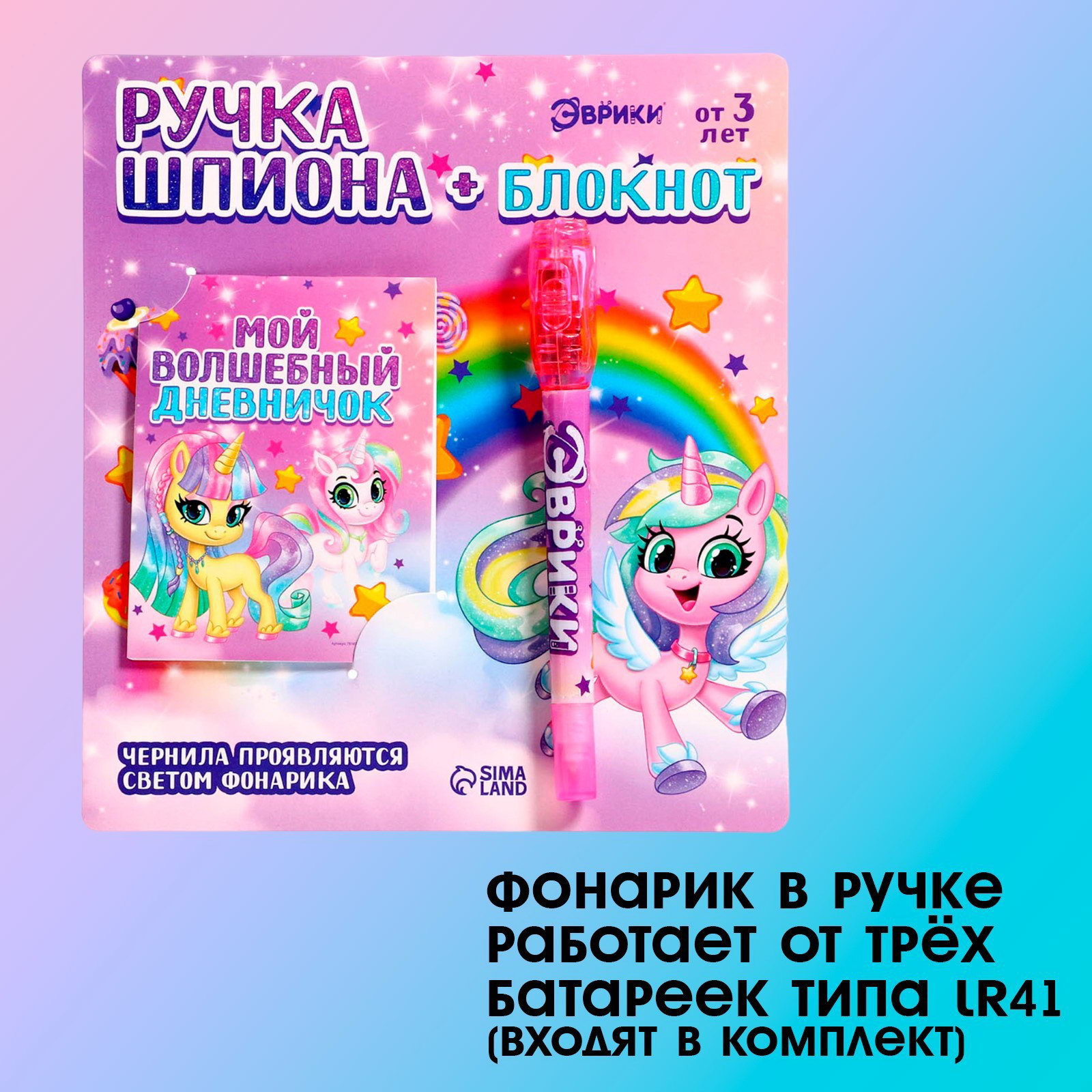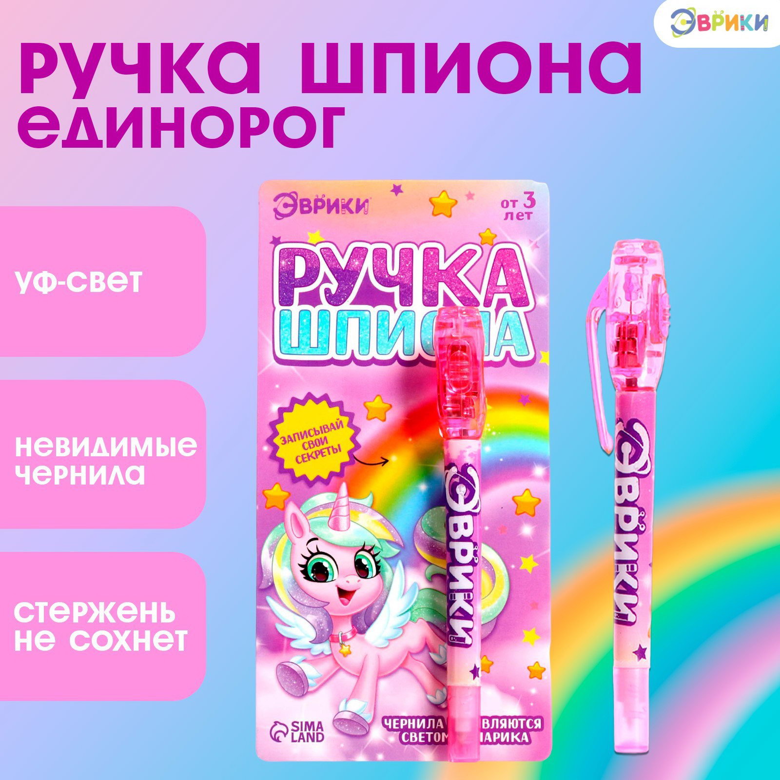 Размер упаковки: 2.5 x 17 x 7 см. Размер упаковки: 2.5 x 17 x 7 см. tnved: 9608101000 Тематика набора: Роспись, раскраска, рисование Возраст: От 3 лет Назначение: Для рисования светом Вид: Ручка Типоразмер батареек: LR41 (AG3, LR736, SR41) Есть обычные ручки, с которыми мы все привыкли работать. Но что если ручка могла бы делать больше, чем просто писать? Ручка с невидимыми чернилами превратит обычное письмо в захватывающую игру шпионов! Ребёнок представит себя тайным агентом, напишет секретное сообщение, которое проявляется только под ультрафиолетом. Особенности ручки