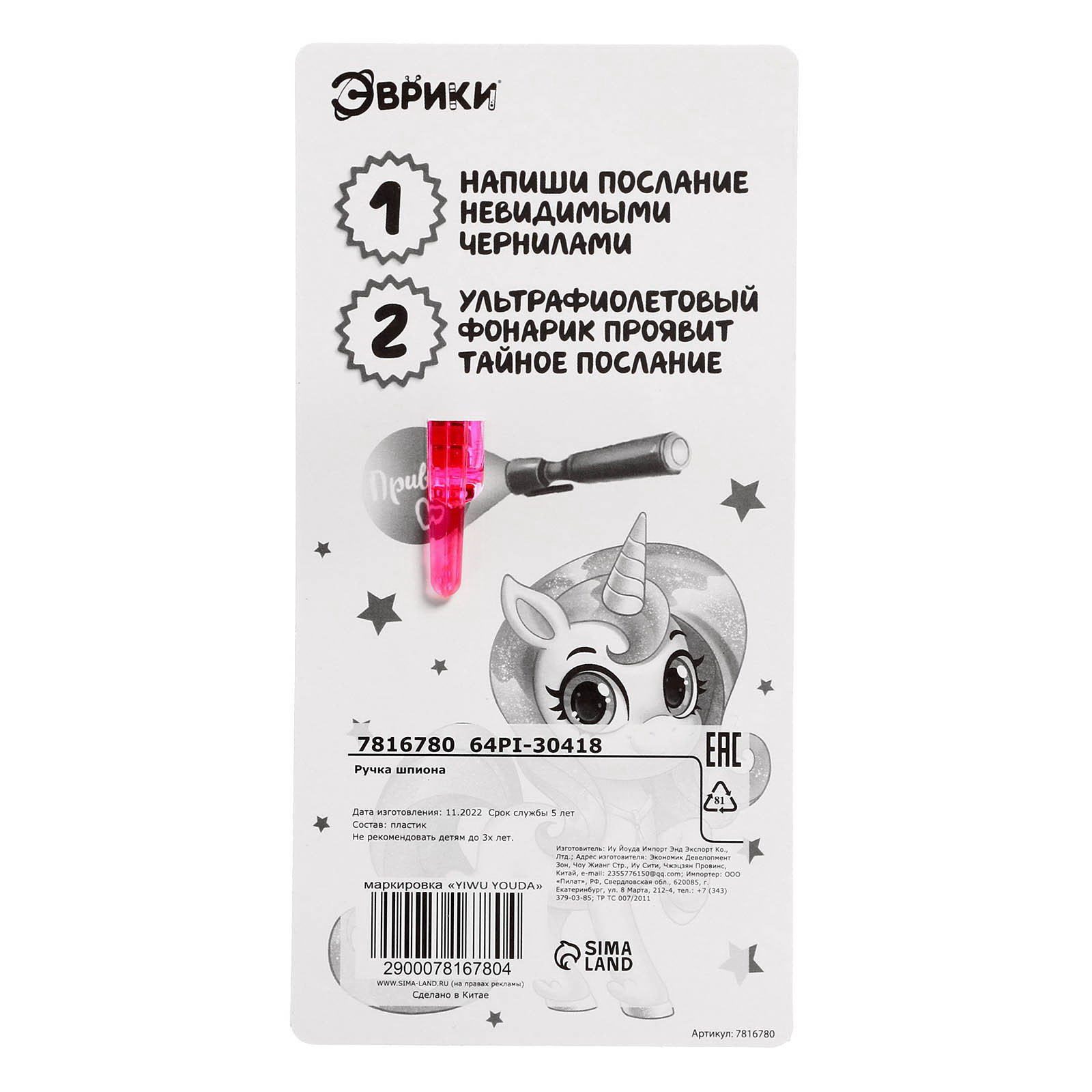 Ручка шпиона "Единорог", ручка, 1.5x8x16 см., Эврики, Китай