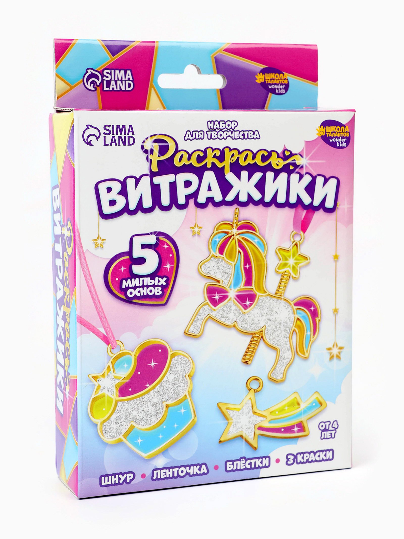 Раскрась витражики "Единороги", 5 форм, набор для творчества, 18x12x3 см., Школа талантов, Китай