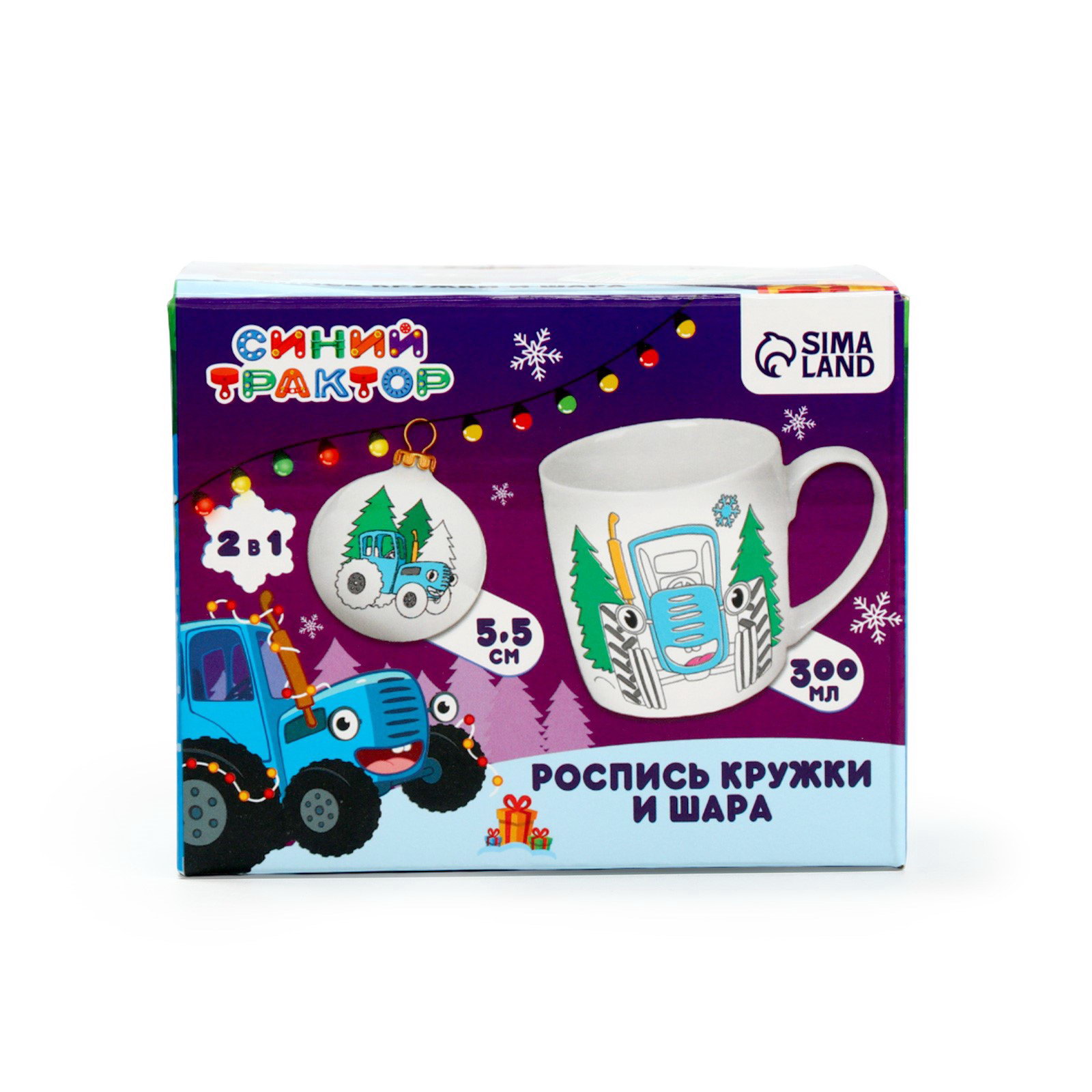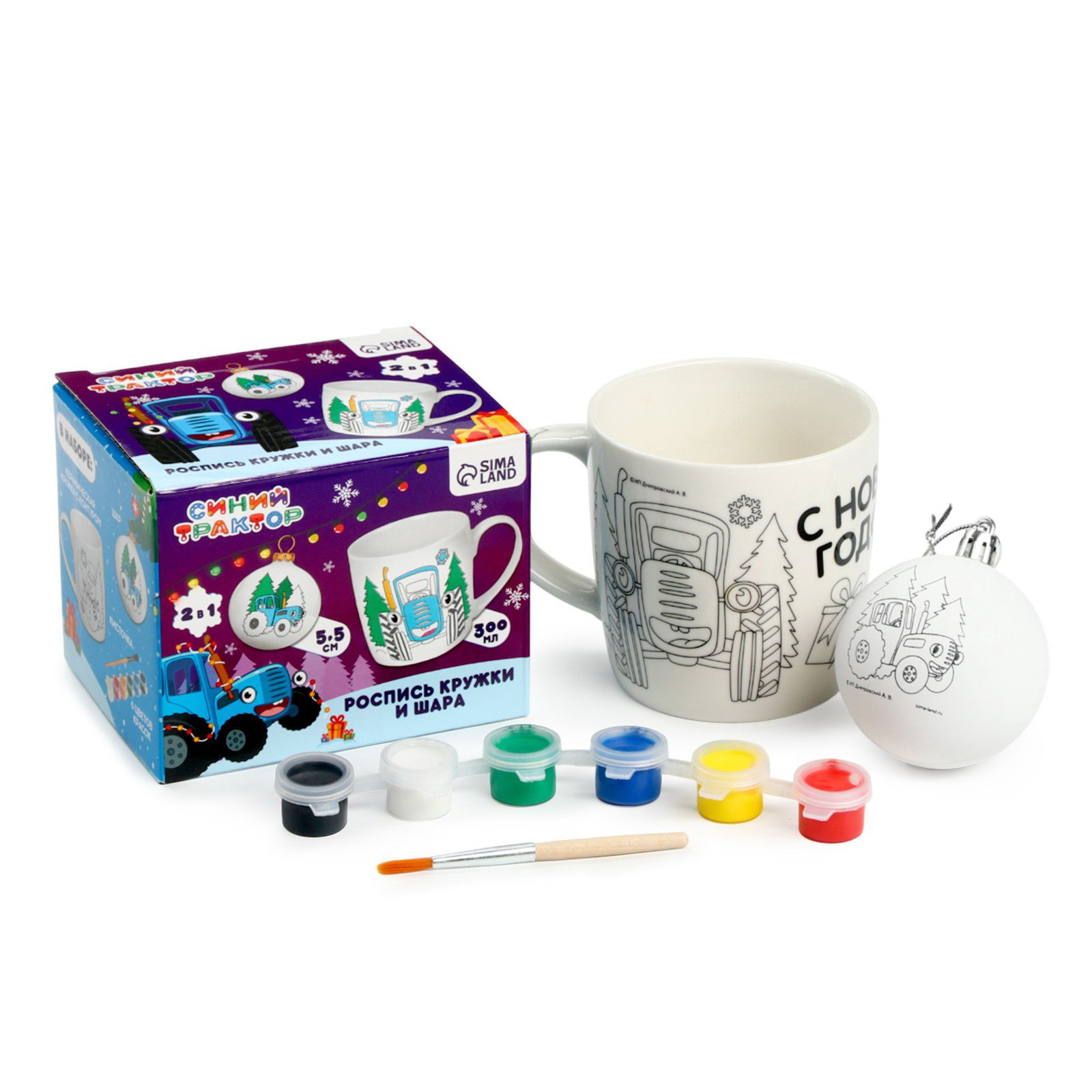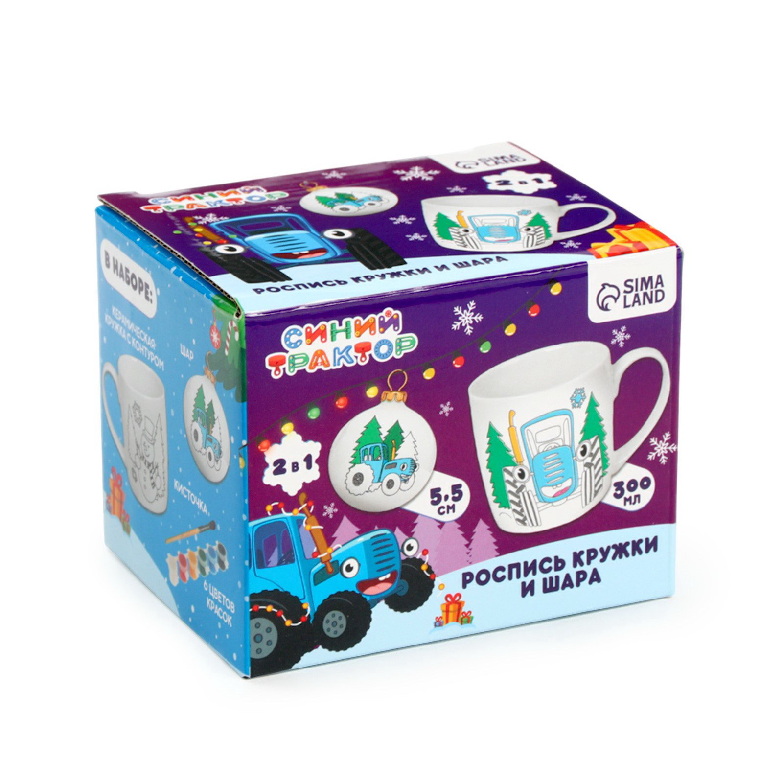 Кружка под раскраску с ёлочным шаром на новый год 300 мл, набор для творчества, 8.7x11.3x8.7 см., Синий трактор, Китай