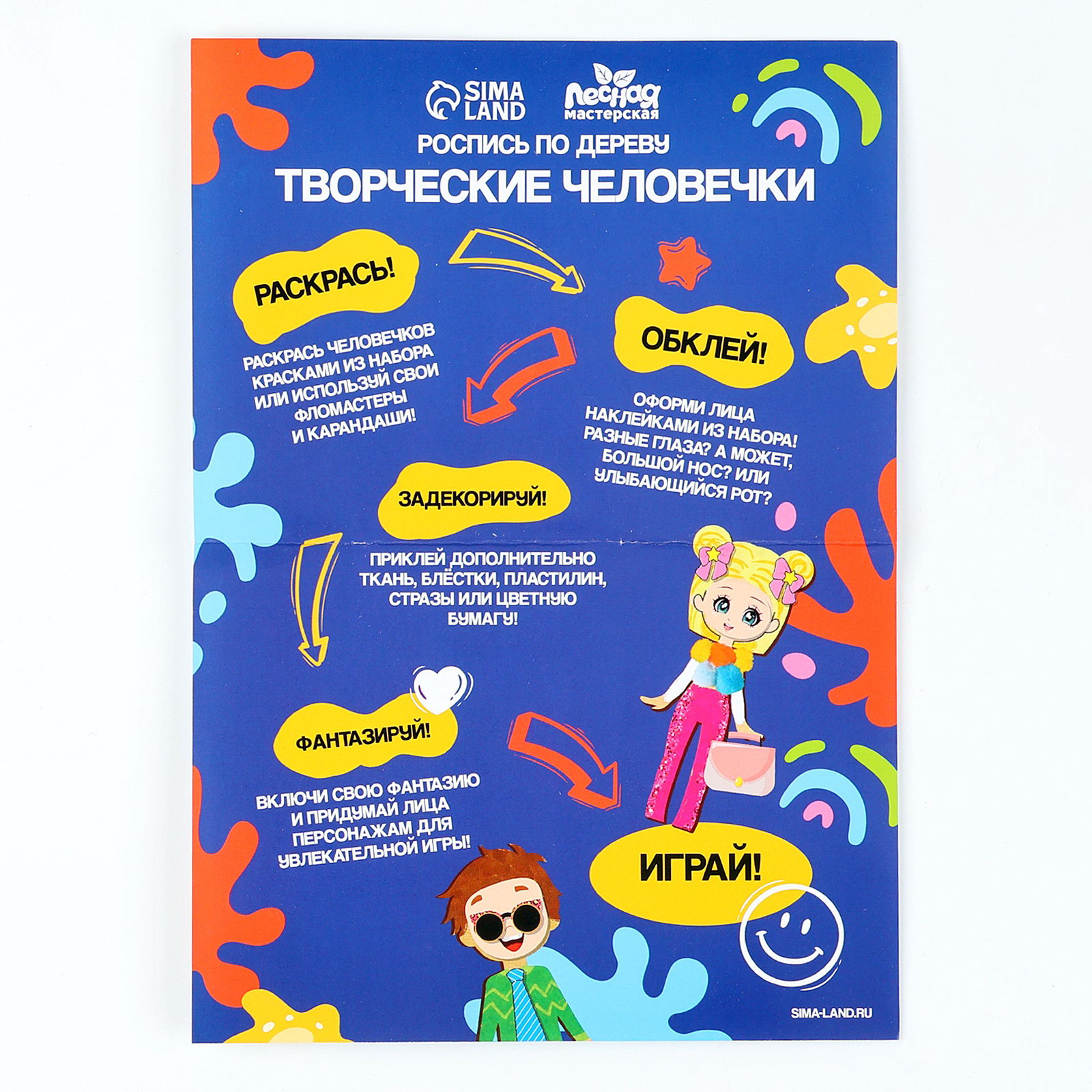 Возраст: Для детей, От 3 лет Комплектация набора: С кистью (-ями), С красками Размер упаковки: 17 x 3.5 x 18.5 см. Сложность головоломки: 5 Материал для аппликации: Дерево Вид: По дереву Вид набора: Из дерева tnved: 3213100000 "Творческие человечки" - это не просто игрушки, это источник радости и вдохновения. Позвольте вашим детям раскрыть свой потенциал, создавая уникальных персонажей и воплощая свои идеи в жизнь. Свобода творчества Дети могут придумывать своих персонажей, на наших фигурках нет заранее заданных контуров. Подходит всем Набор подходит и для девочек, и для мальчиков. Каждый может создать своего уникального персонажа. Полезное занятие Набор развивает фантазию детей, их творческое мышление и учит решать задачи оригинально. КАК ИГРАТЬ?
