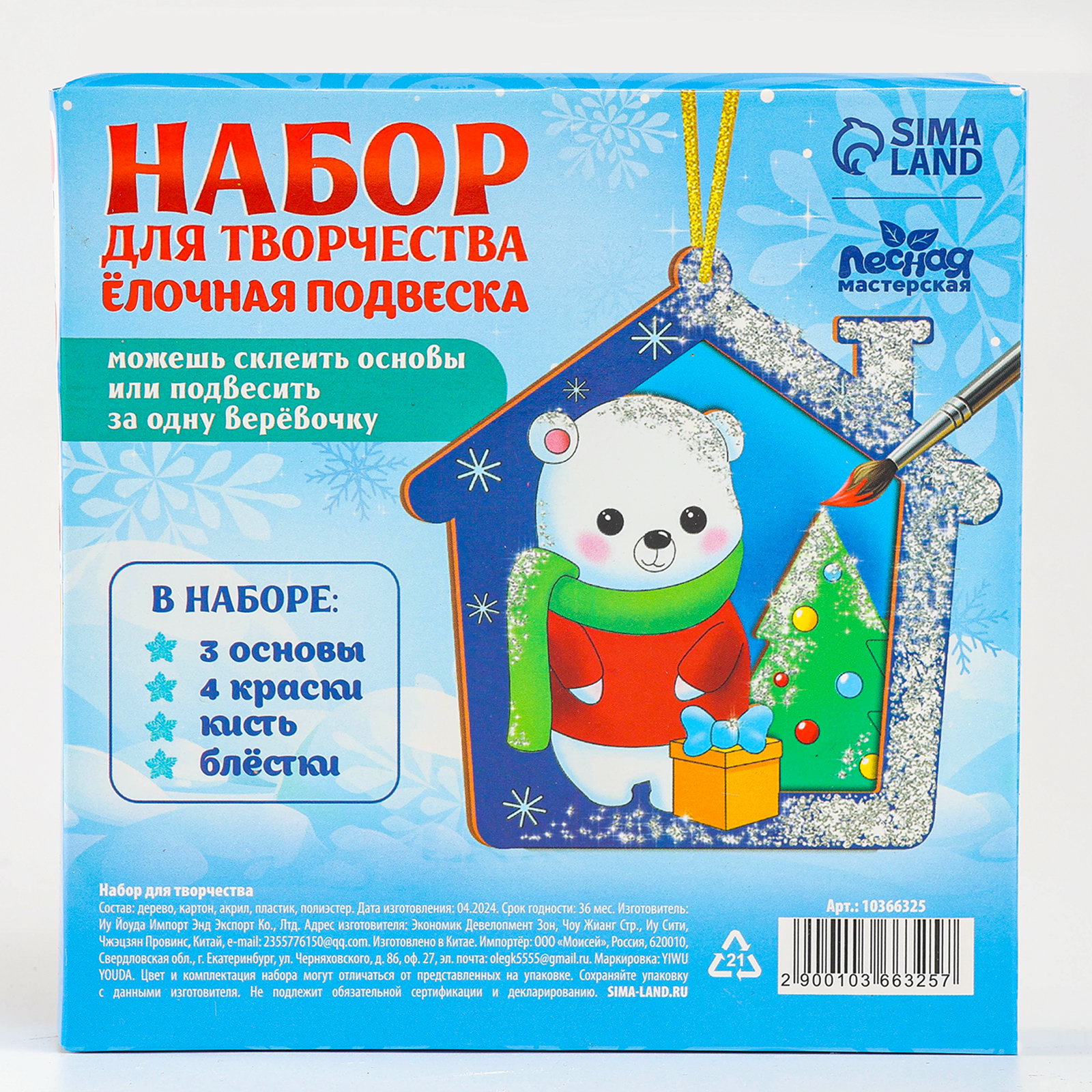 Комплектация набора: С блёстками, С кисточками, С красками Возраст: Для детей, От 3 лет Вид набора: Ёлочные украшения, Из дерева Размер упаковки: 13 x 2.5 x 13 см. Вид заготовки: Ёлочное украшение Набор: Да Вид: По дереву Тематика: Новогодняя Размер, см: 11 x 11 Для создания: Ёлочная игрушка Количество цветов: 4 Тематика праздника: Новый год Для кого: Унисекс Символ года: Нет Составляющие набора: Товары для творчества tnved: 9505109000 tnved: 9505109000 С набором для росписи по дереву у вас получится объёмная многослойная деревянная игрушка на ёлку. Особенности набора