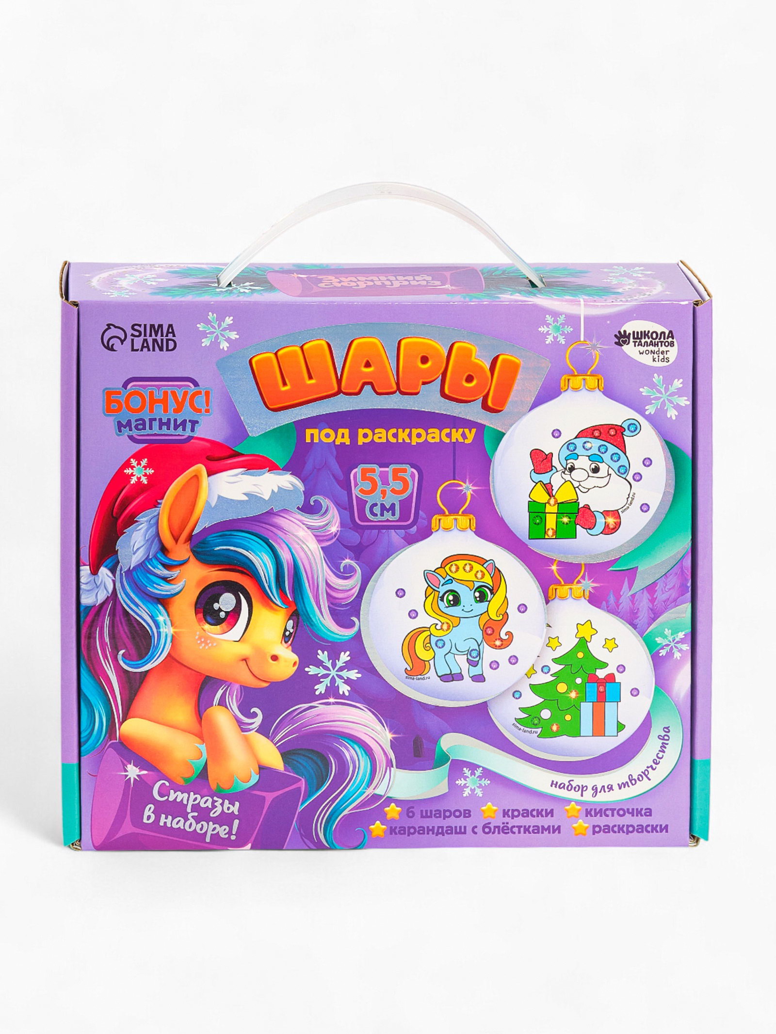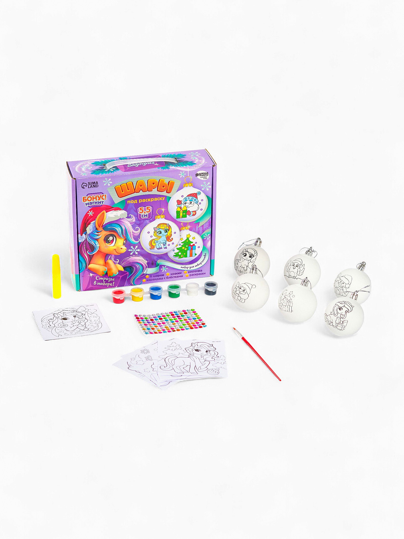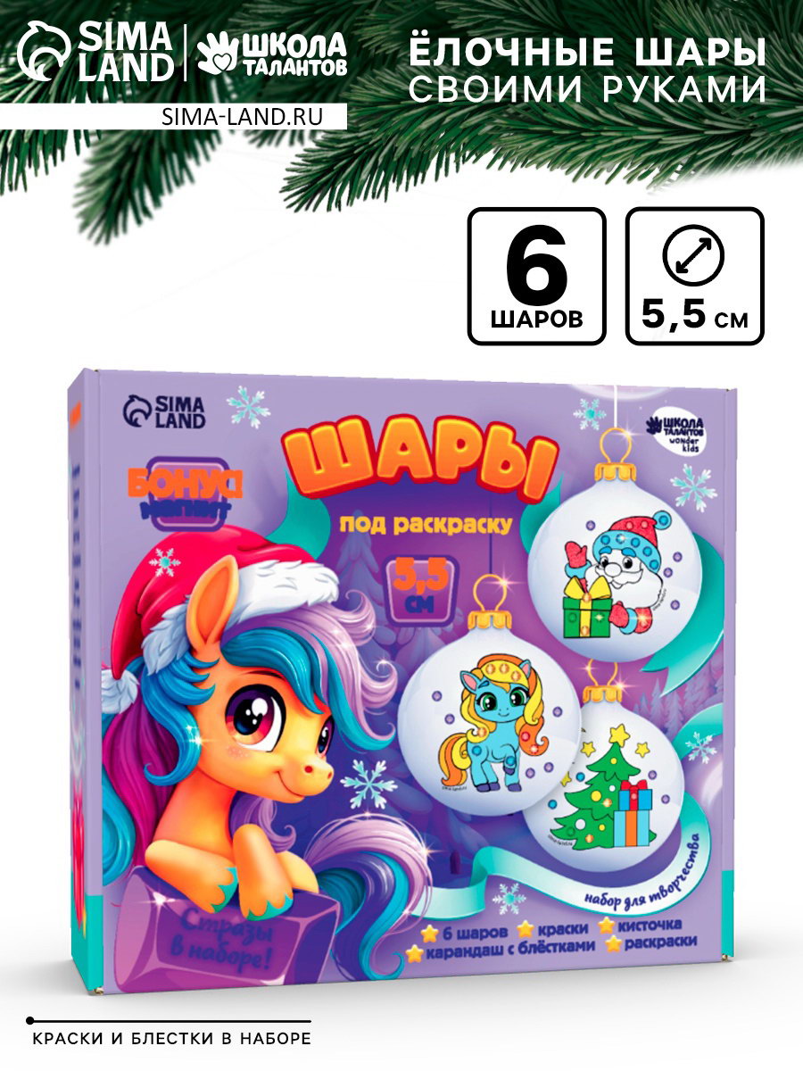 Комплектация набора: С красками, Со стразами Размер упаковки: 6.5 x 20.5 x 22.5 см. tnved: 3213100000 Вид заготовки: Ёлочное украшение Вид: По пластику Вид набора: Ёлочные шары Возраст: Для детей Набор: Да Тематика праздника: Новый год Символ года: Символ года 2026 (Лошадь) Этот набор - отличный повод провести волшебный вечер в кругу семьи!Предложите малышу создать своими руками уникальные украшения для вашей ёлочки. В наборе шары с нанесённым рисунком. Вам остаётся лишь проявить фантазию и раскрасить их на свой вкус. Набор шаров также станет прекрасным подарком друзьям и близким. Комплектация