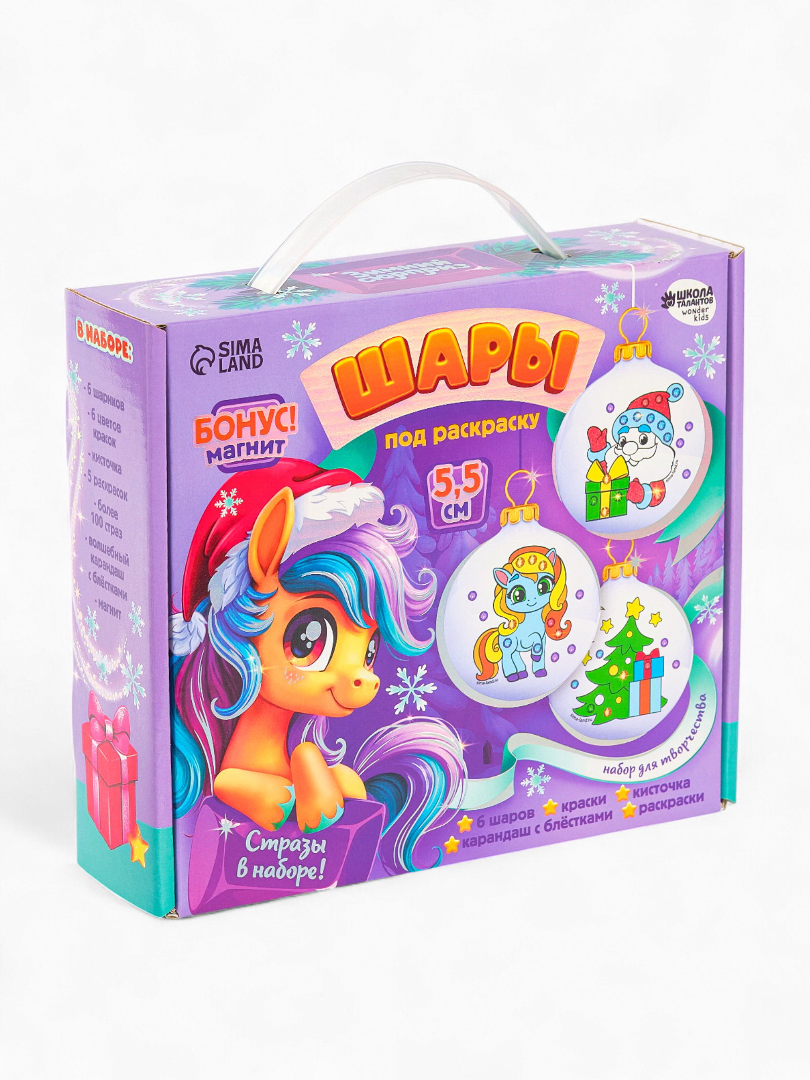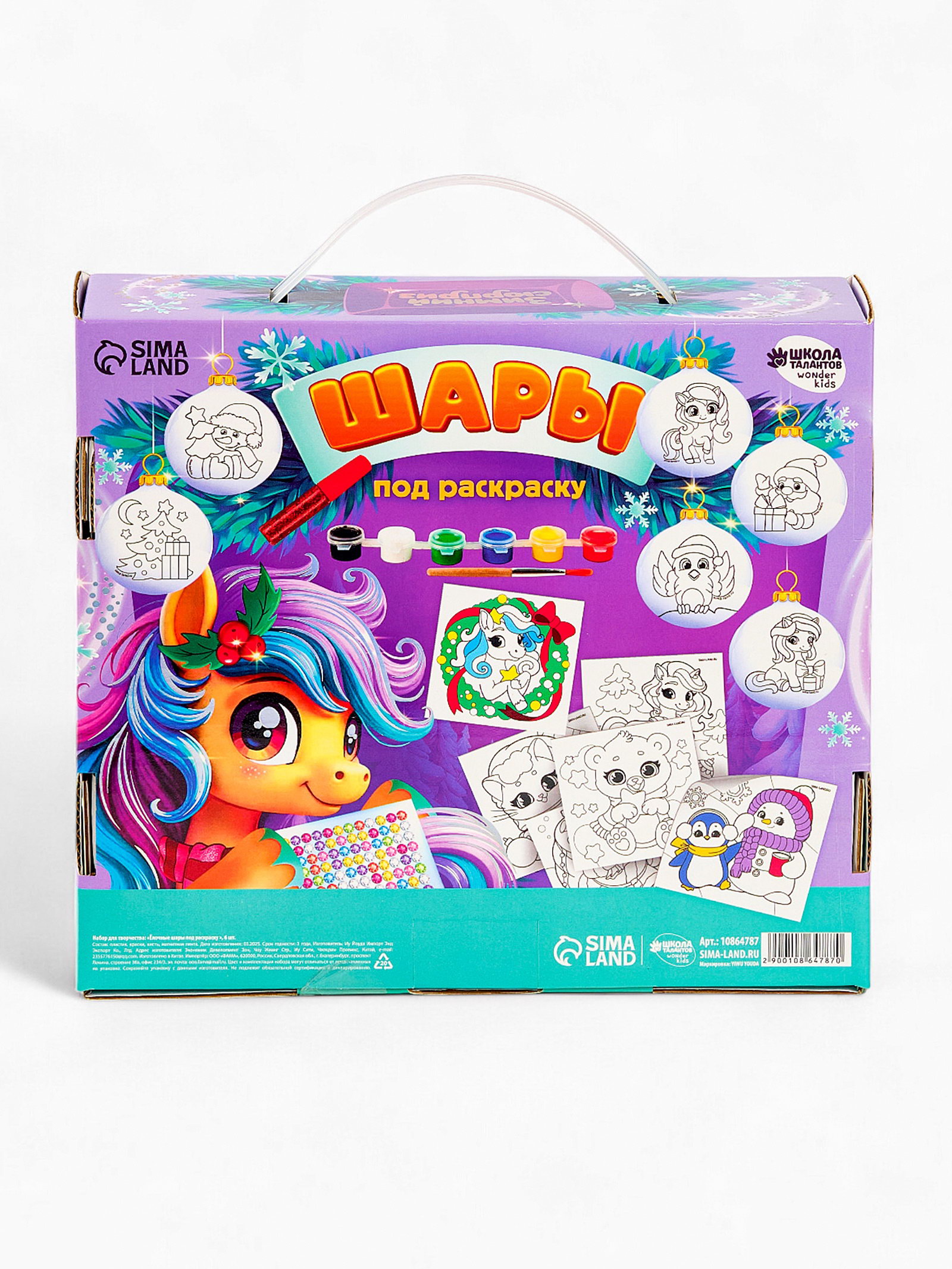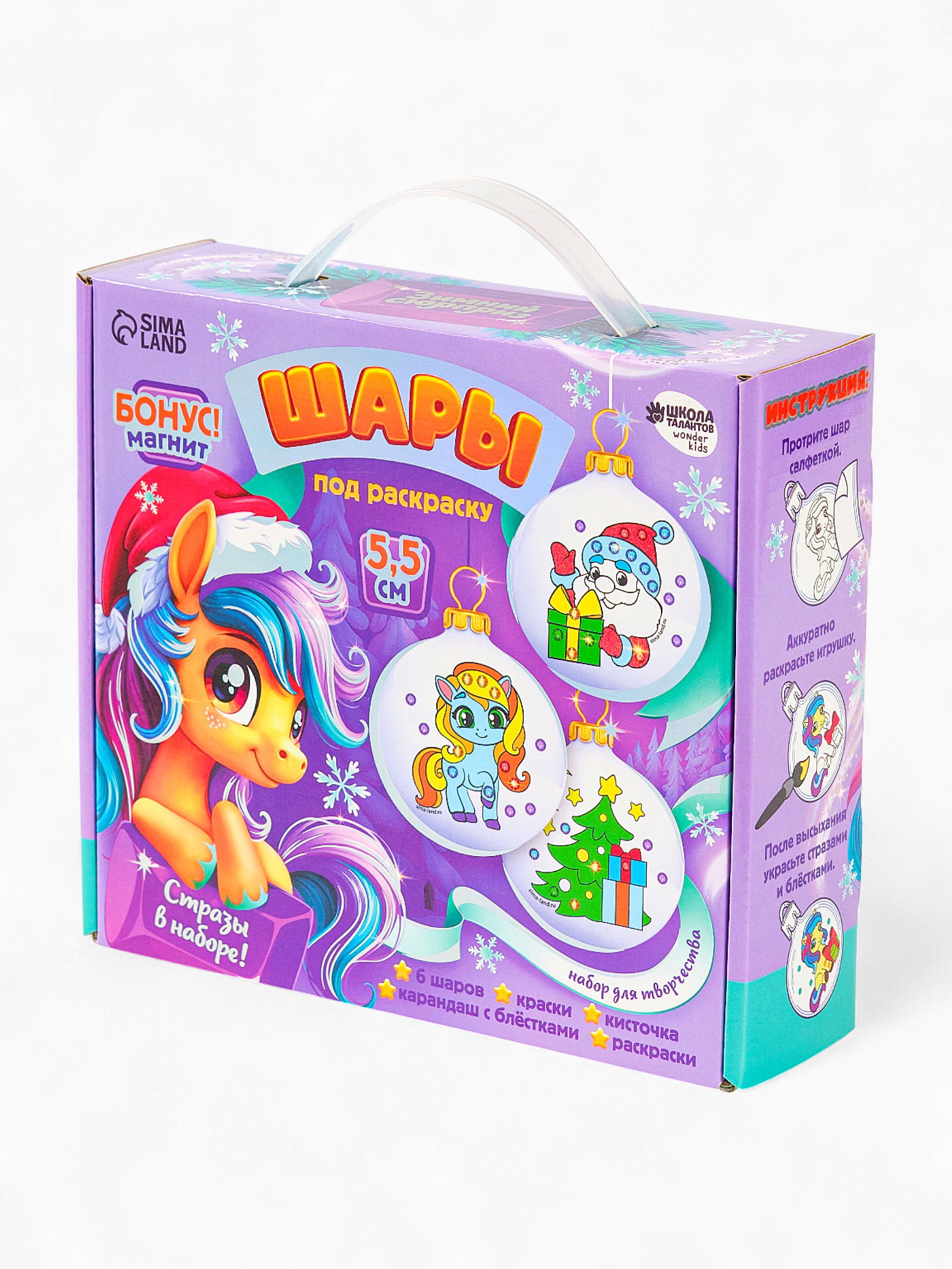 Комплектация набора: С красками, Со стразами Размер упаковки: 6.5 x 20.5 x 22.5 см. tnved: 3213100000 Вид заготовки: Ёлочное украшение Вид: По пластику Вид набора: Ёлочные шары Возраст: Для детей Набор: Да Тематика праздника: Новый год Символ года: Символ года 2026 (Лошадь) Этот набор - отличный повод провести волшебный вечер в кругу семьи!Предложите малышу создать своими руками уникальные украшения для вашей ёлочки. В наборе шары с нанесённым рисунком. Вам остаётся лишь проявить фантазию и раскрасить их на свой вкус. Набор шаров также станет прекрасным подарком друзьям и близким. Комплектация