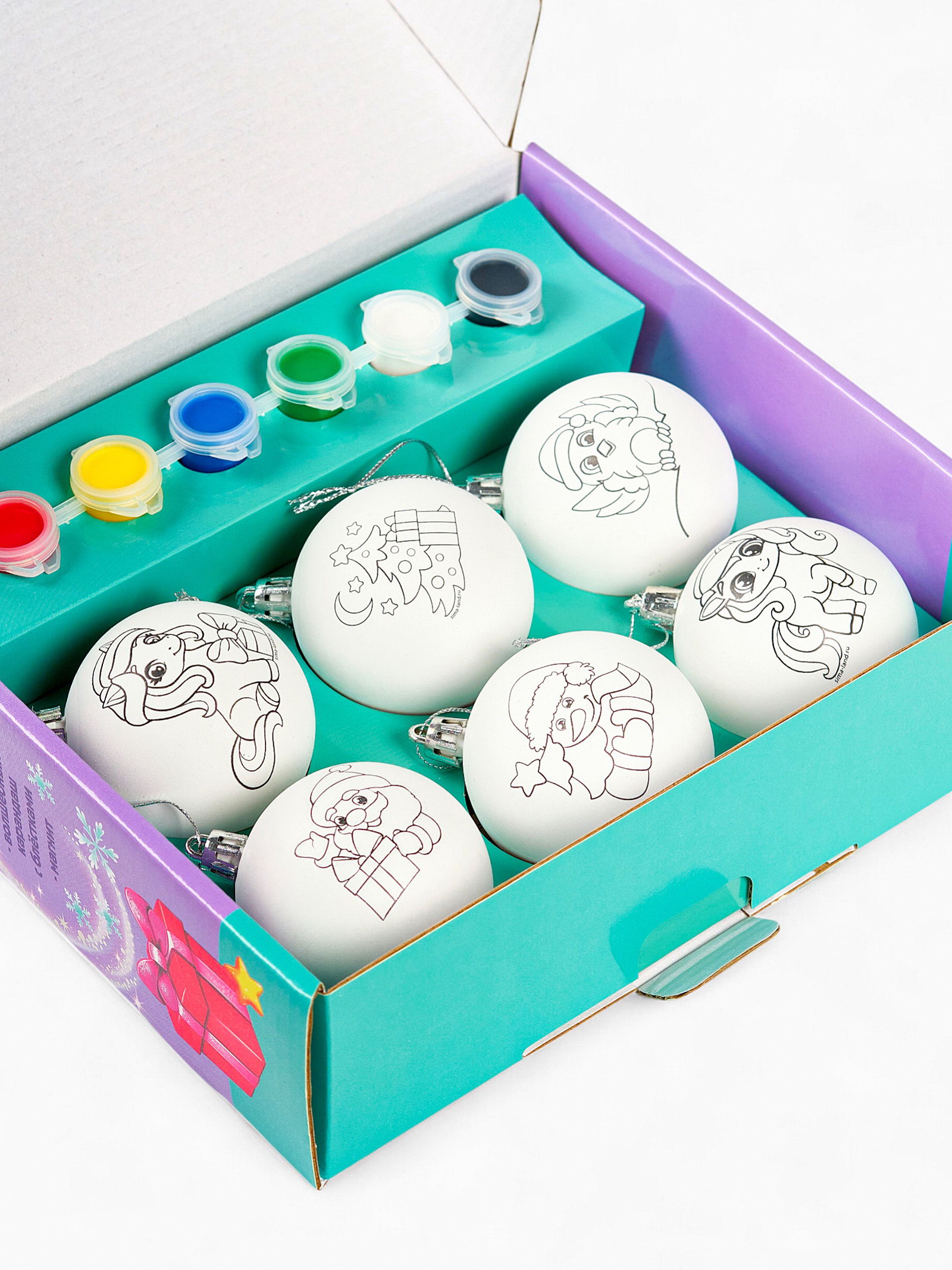 Елочные шары под раскраску "Новогодний сюрприз", набор 6 шт. + краски, 19.7x22.2x6.3 см., Школа талантов, Китай