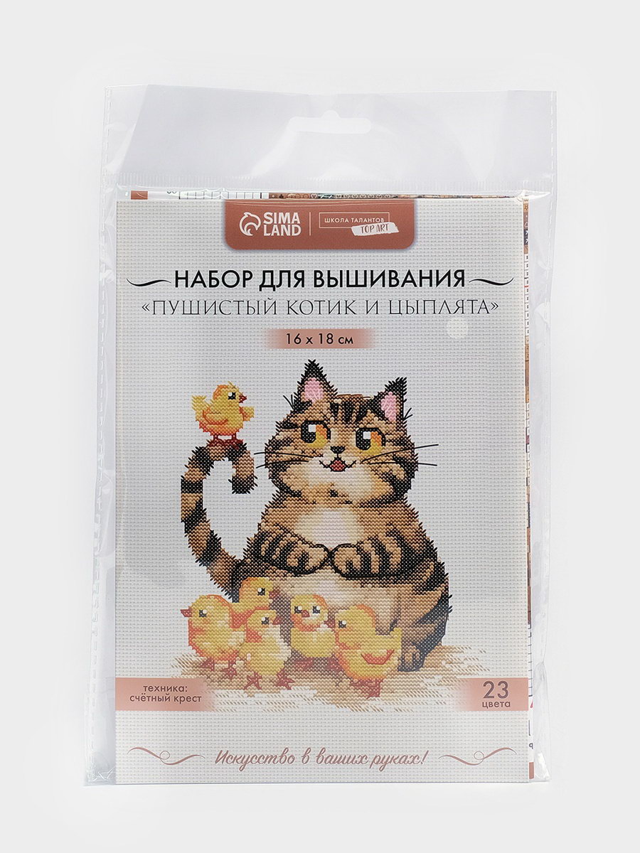 Вышивка крестиком "Пушистый котик и цыплята", набор для творчества, 16x18 см, 14.5x21x3 см., Школа талантов, Китай