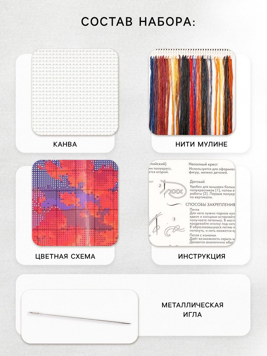 Комплектация: Игла, Инструкция, Канва, Нитки, Схема Размер упаковки: 21 x 2 x 30 см. tnved: 6308000000 Возраст: Любой Количество цветов ниток: 30 Длина, см: 45 Рисунок на канве: Нет Каунт канвы: 11 ct Материал канвы: Хлопок Тематика: Природа Тип канвы: Равномерная Уровень сложности: Средний Ширина, см: 35 Техника вышивания: Вышивка крестом Тип выкладки: С полным заполнением С набором для вышивки у вас получится смастерить своими руками настоящий шедевр. Как работать с набором