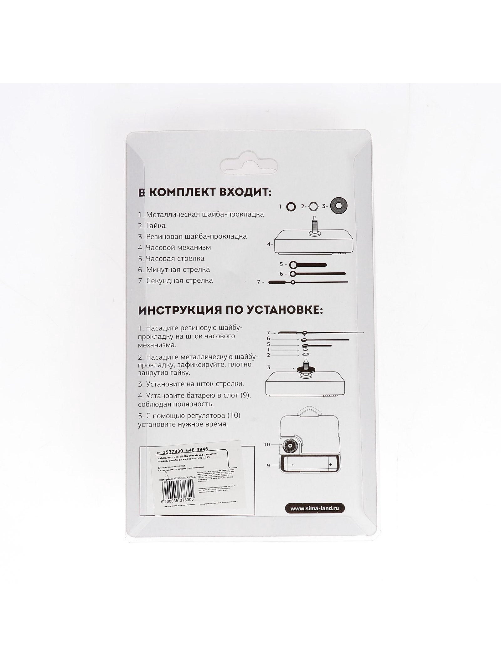 Размер упаковки: 11 x 4 x 18 см. Подсветка: Нет tnved: 9109100000 Длина секундной стрелки, мм: 98 Длина минутной стрелки, мм: 95 Длина штока, мм: 12 Длина резьбы, мм: 6 Ход стрелок: Плавный Точный и надёжный часовой механизм с плавным ходом стрелок создан для тех, кто ценит безупречную точность и минимальный уровень шума. Его конструкция сочетает в себе прочность металла и лёгкость пластика, что обеспечивает долговечность и стабильную работу на протяжении многих лет. Оптимальные размеры стрелок 60 мм для часовой, 95 мм для минутной и 98 мм для секундной гарантируют удобное считывание времени даже с большого расстояния. Благодаря длине штока 12 мм и резьбе 6 мм установка механизма в корпус часов проходит быстро и надёжно.
