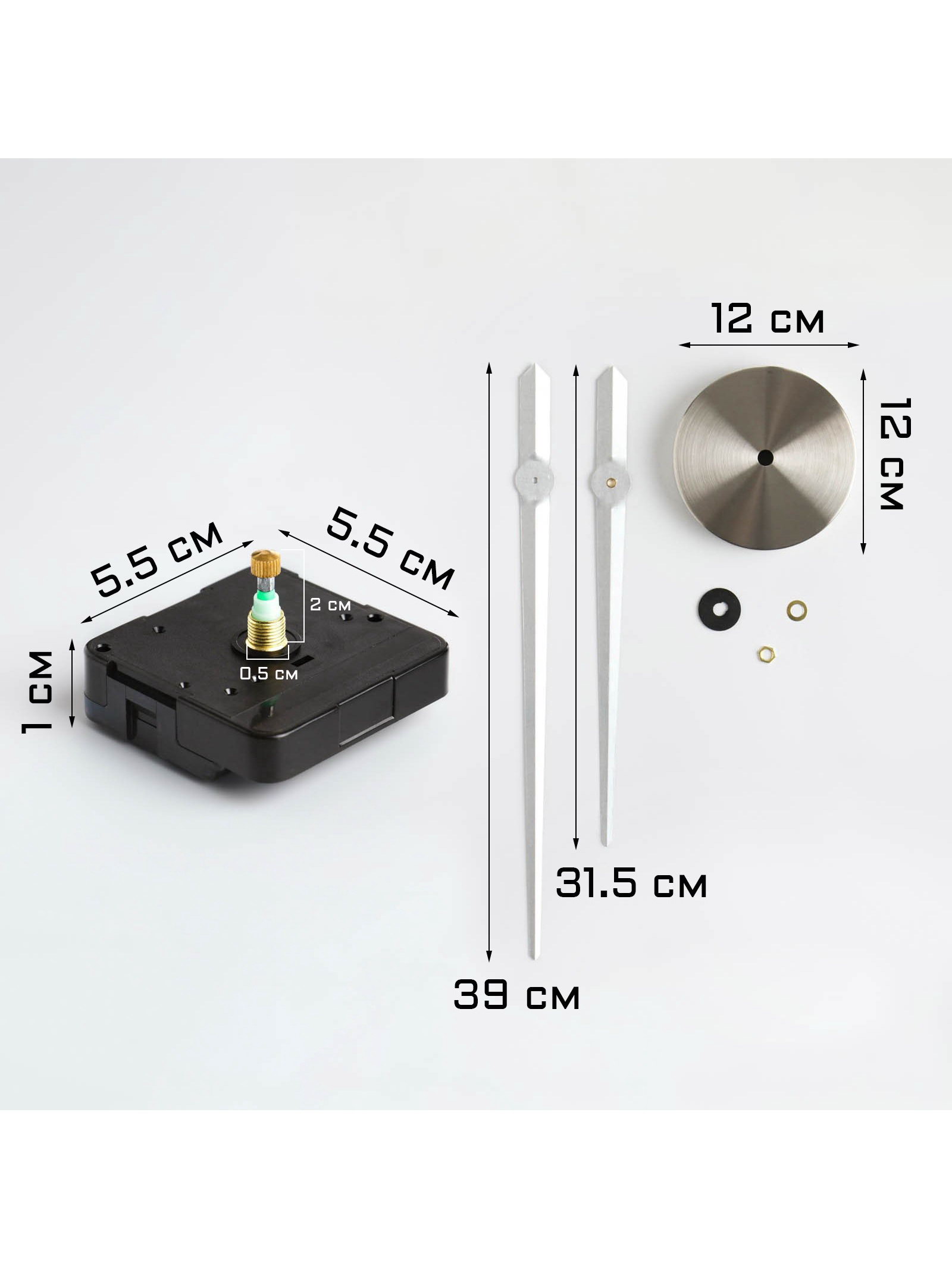 Размер упаковки: 10 x 3 x 32 см. tnved: 9109100000 tnved: 9109100000 Длина минутной стрелки, мм: 310 Длина часовой стрелки, мм: 240 Ход стрелок: Плавный Длина резьбы, мм: 6 Подсветка: Нет Длина штока, мм: 20 Элегантный часовой механизм с плавным ходом стрелок отличается внушительными размерами и изящным серебристым оттенком, который станет эффектным акцентом в интерьере любого помещения. Длина часовой стрелки достигает 240 мм, а минутной 310 мм, что обеспечивает отличную читаемость даже на крупных настенных часах. Изготовленный из высококачественного пластика, механизм сочетает лёгкость и надёжность, а длина штока 20 мм с резьбой 6 мм гарантирует простоту монтажа и совместимость с большинством стандартных корпусов.