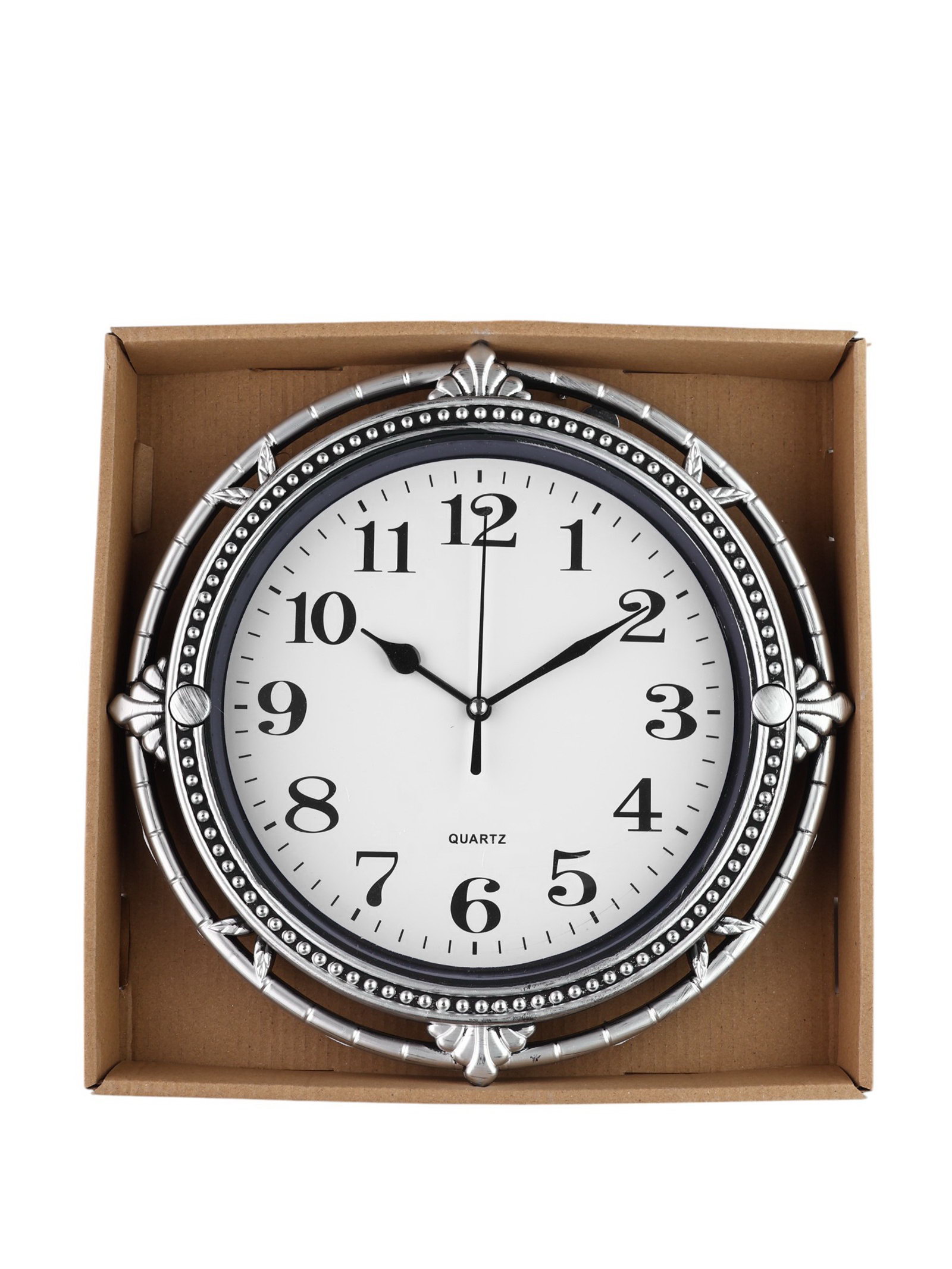 Размер упаковки: 28 x 5 x 28 см. Форма: Круглая Бесшумные: Нет Тематика: Интерьер Тип питания: От батареек Типоразмер батареек: AA (LR6) Работает от сети: Нет Работает от сети: Нет tnved: 9105210000 Тип индикации: Арабские цифры Высота, см: 27 Ход стрелок: Дискретный Ширина, см: 27 Тип механизма: Кварцевый Цвет корпуса: Серебристый Цвет циферблата: Белый Особенности