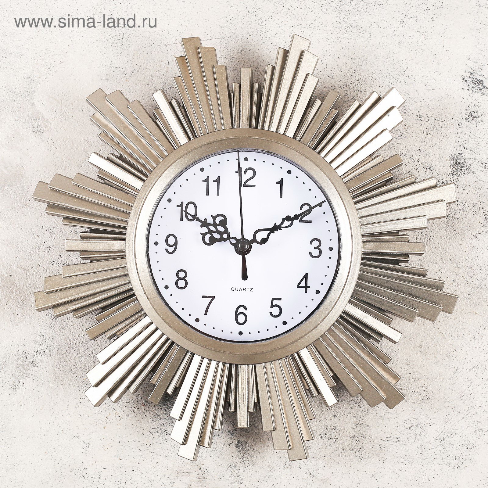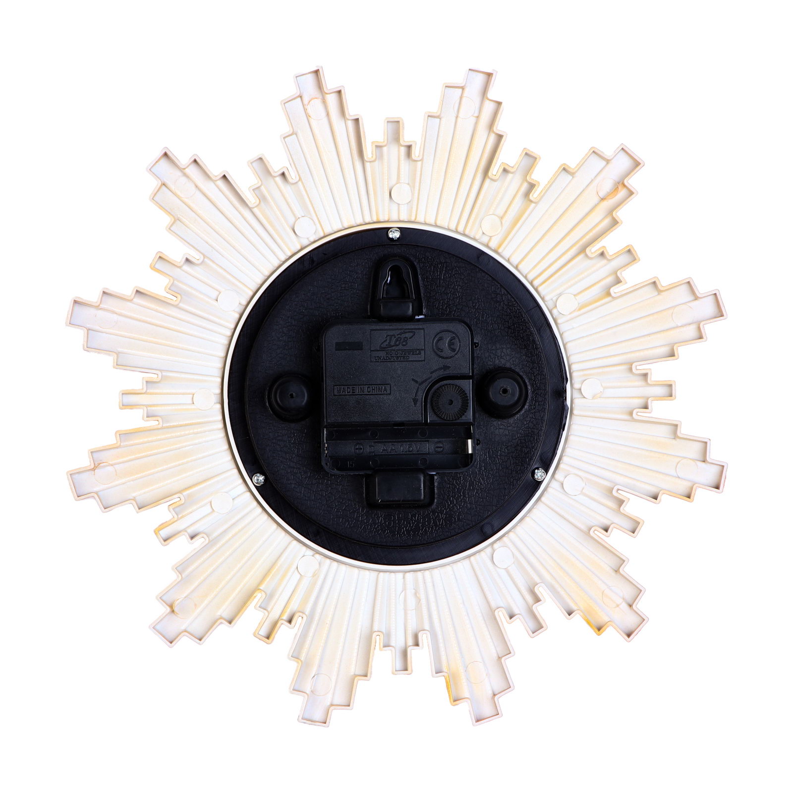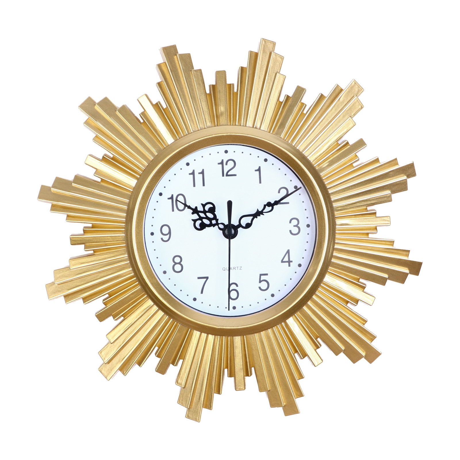 Размер упаковки: 26 x 4 x 26 см. Цвет: Золотистый Цвет корпуса: Золотистый Ход стрелок: Дискретный Тематика: Интерьер Работает от сети: Нет Бесшумные: Нет Тип питания: От батареек Типоразмер батареек: AA (LR6) tnved: 9105210000 Цвет циферблата: Белый Форма: Фигурная Ширина, см: 25 Высота, см: 25 Тип индикации: Арабские цифры Тип механизма: Кварцевый Особенности