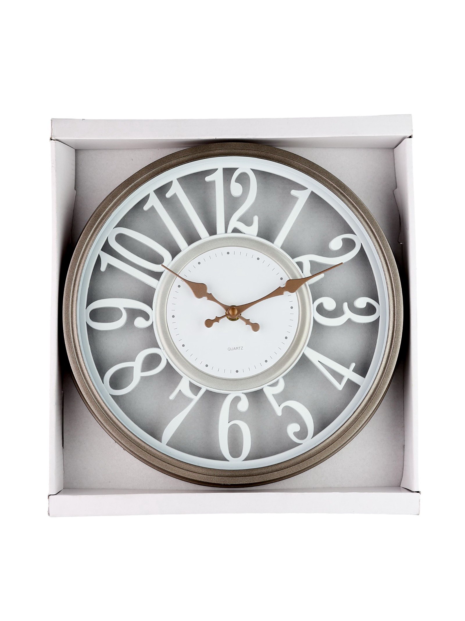 Размер упаковки: 34.5 x 4.5 x 32 см. Бесшумные: Да Работает от сети: Нет Типоразмер батареек: AA (LR6) Тип питания: От батареек Тематика: Интерьер Тематика: Интерьер tnved: 9105210000 Форма: Круглая Тип индикации: Арабские цифры Высота, см: 29 Ширина, см: 29 Ход стрелок: Плавный Цвет корпуса: Коричневый Тип механизма: Кварцевый Цвет циферблата: Белый | ||