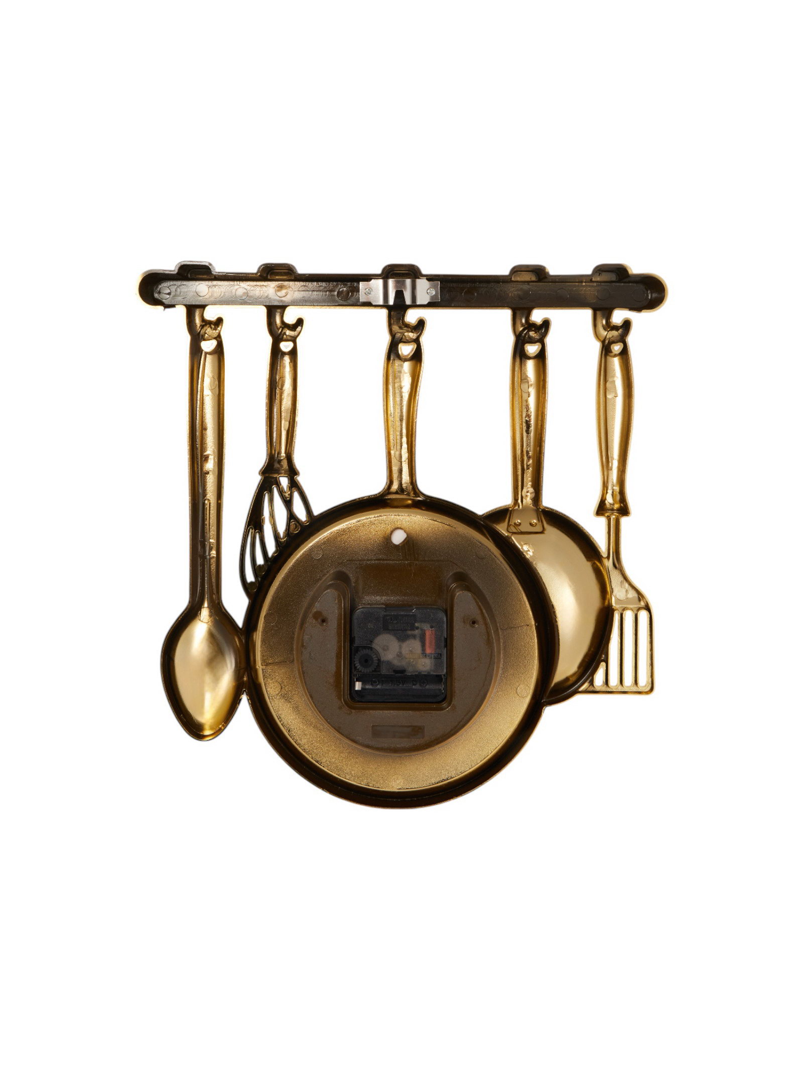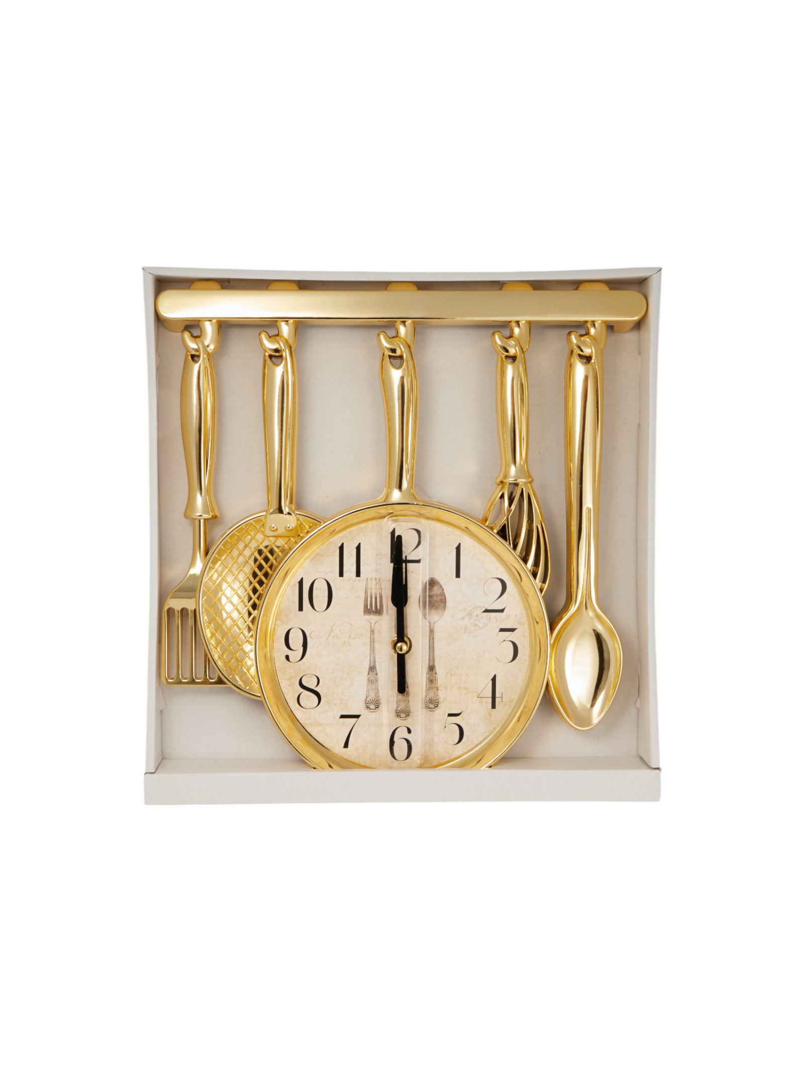 Размер упаковки: 4.5 x 33 x 32 см. Ход стрелок: Плавный Тип механизма: Кварцевый Цвет корпуса: Золотистый Тип индикации: Арабские цифры Форма: Фигурная Цвет циферблата: Золотистый Тематика: Кухня Высота, см: 30 Бесшумные: Да Ширина, см: 32 Ширина, см: 32 tnved: 9105210000 Тип питания: От батареек Типоразмер батареек: AA (LR6) Форма корпуса: Фигурная Работает от сети: Нет Особенности