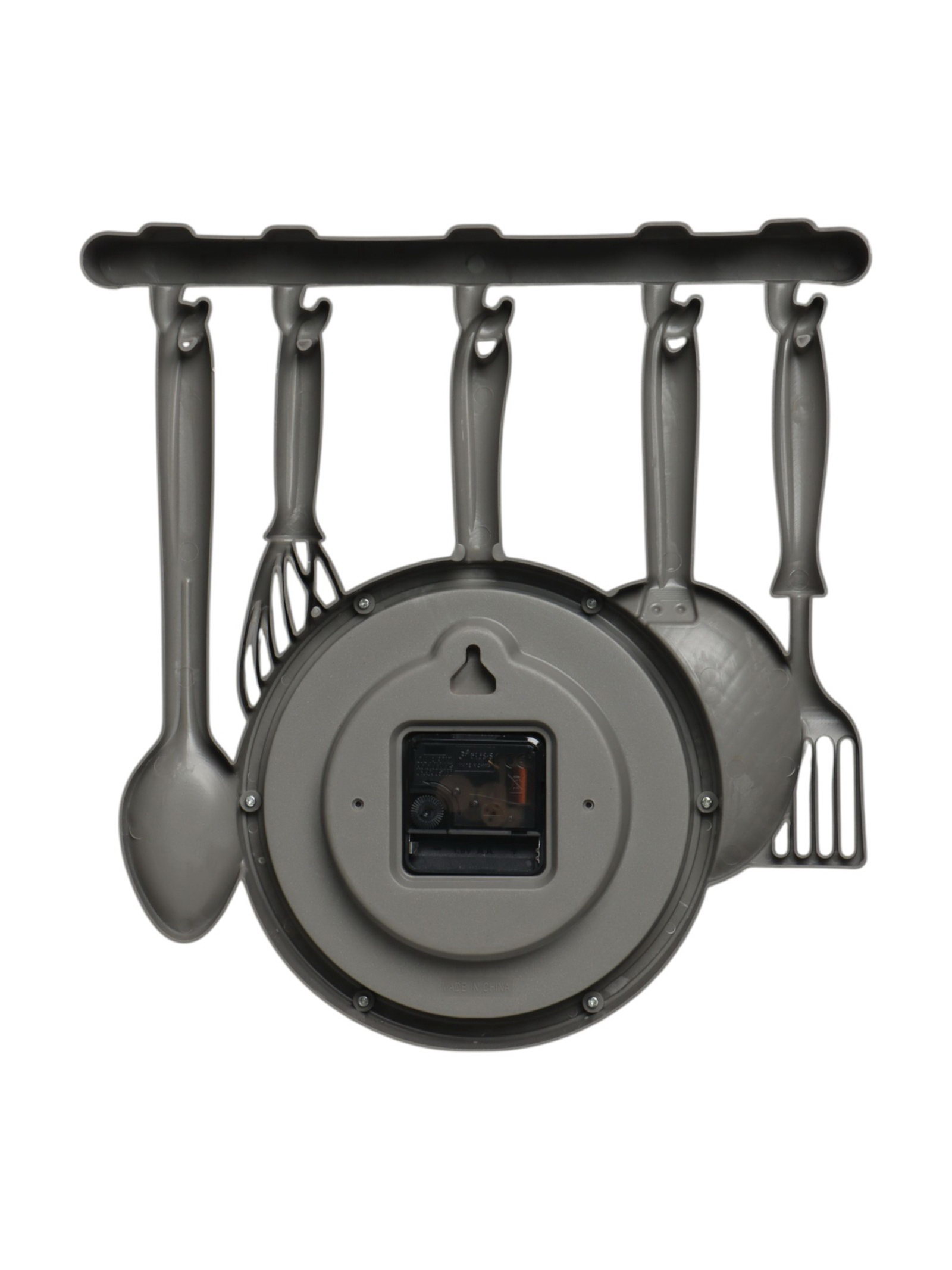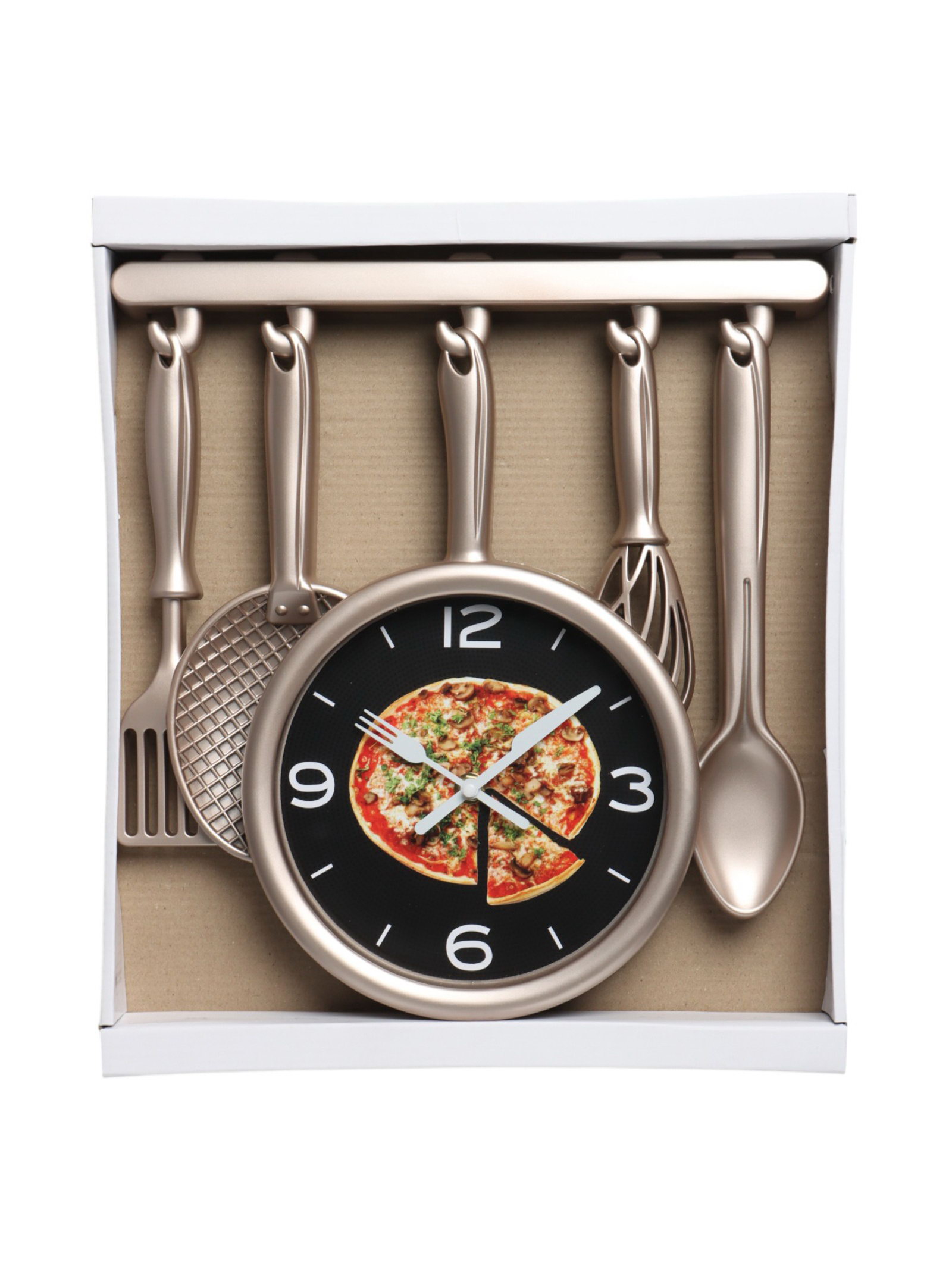 Размер упаковки: 39 x 33 x 5 см. Тип индикации: Арабские цифры Тип механизма: Кварцевый Цвет циферблата: Чёрный Ход стрелок: Плавный Цвет корпуса: Бронзовый Тематика: Кухня Высота, см: 34 Бесшумные: Да Ширина, см: 32 Форма: Фигурная tnved: 9105210000 Тип питания: От батареек Форма корпуса: Фигурная Типоразмер батареек: AA (LR6) Работает от сети: Нет Особенности
