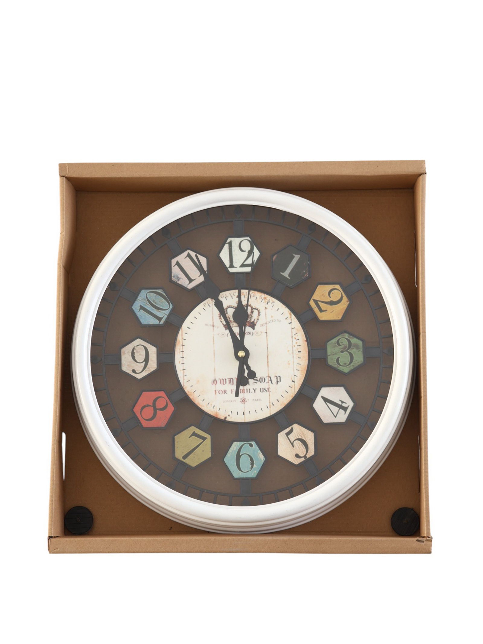 Размер упаковки: 41 x 6 x 38.5 см. Бесшумные: Нет Тематика: Интерьер Типоразмер батареек: AA (LR6) Тип питания: От батареек Работает от сети: Нет Работает от сети: Нет tnved: 9105210000 Форма: Круглая Тип индикации: Арабские цифры Высота, см: 37 Ширина, см: 37 Ход стрелок: Дискретный Тип механизма: Кварцевый Цвет корпуса: Белый Цвет циферблата: Разноцветный Особенности