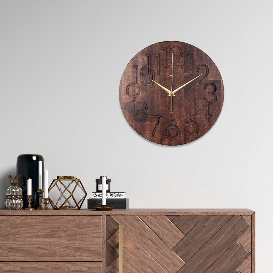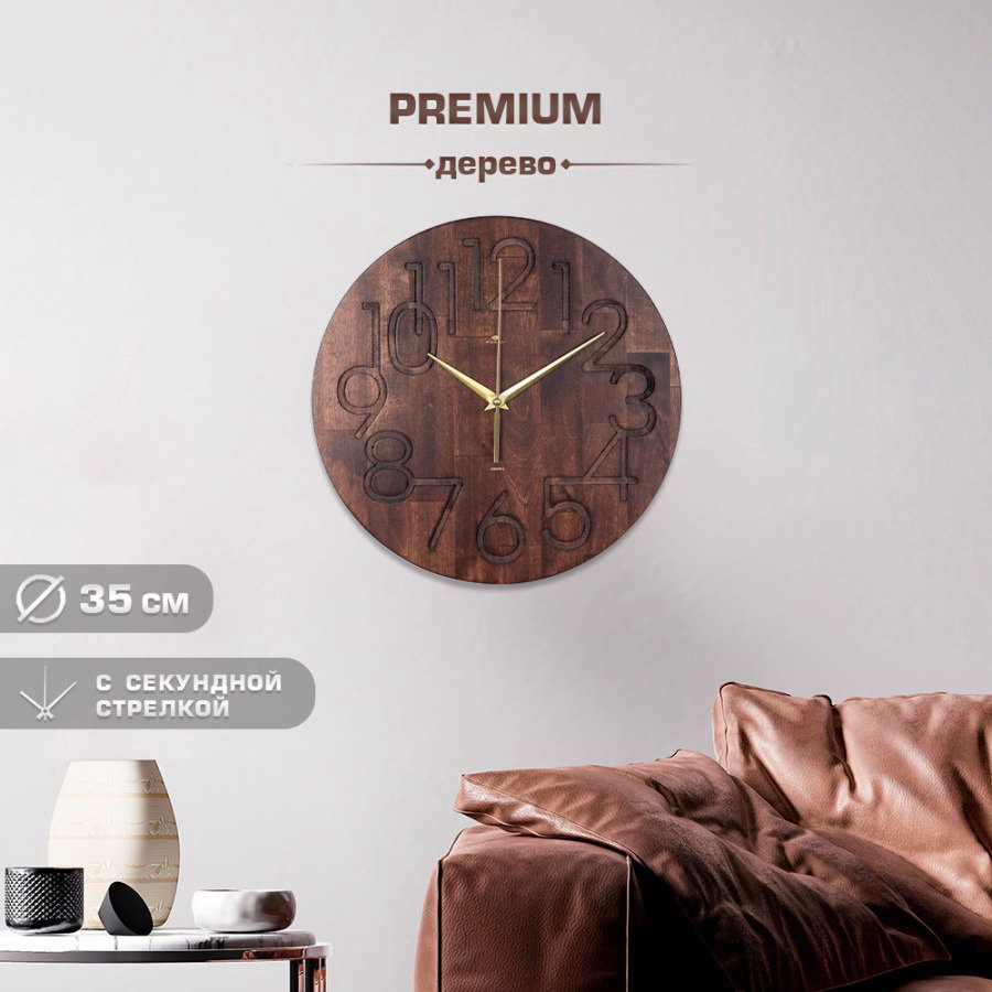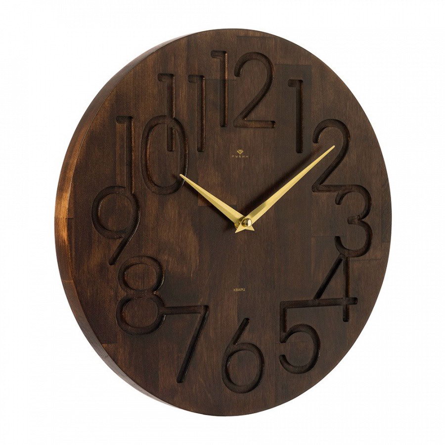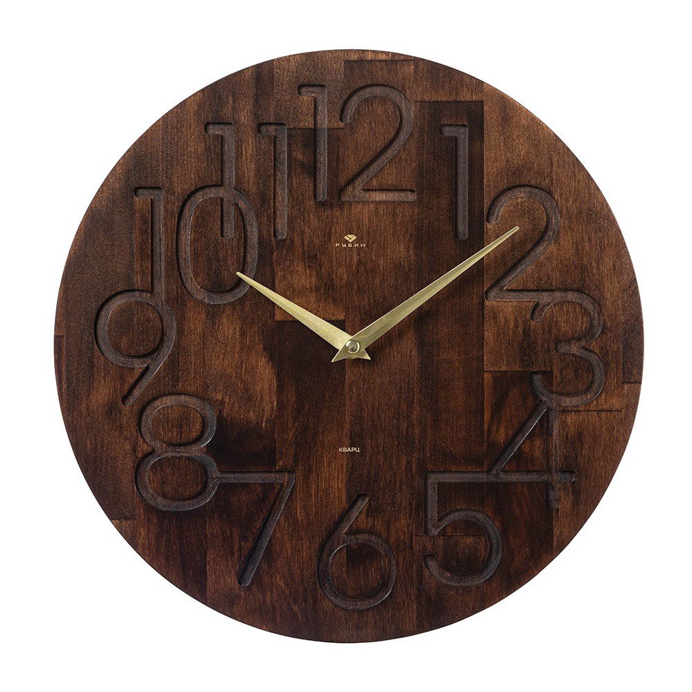 Часы настенные, интерьерные, бесшумные, d-35 см, дерево, открытые, темный циферблат, Рубин, Россия