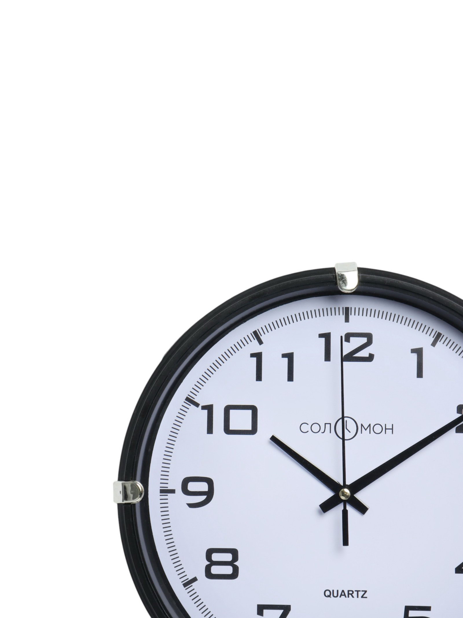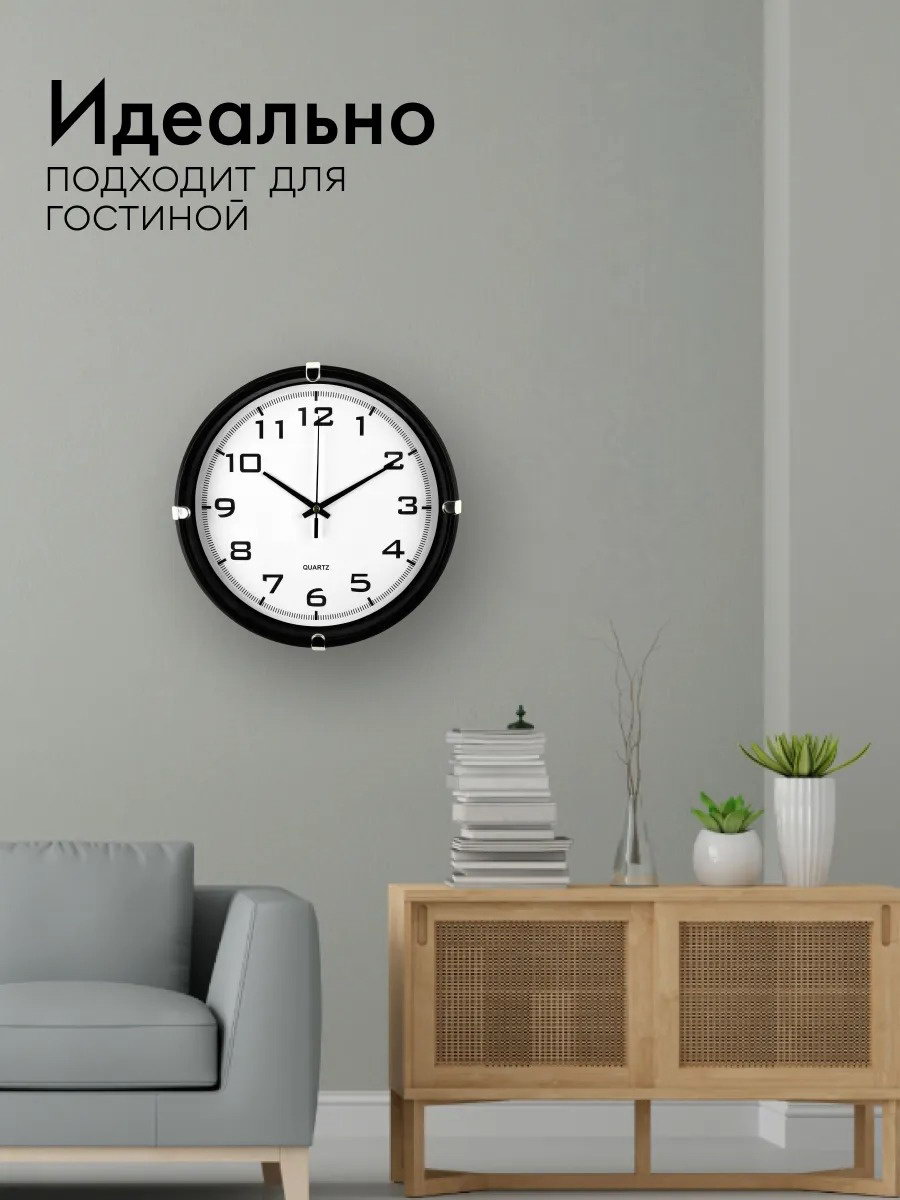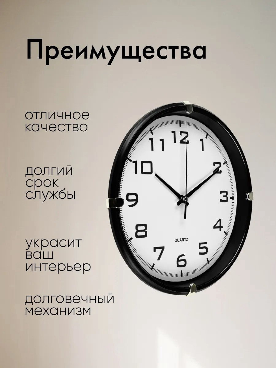 Размер упаковки: 3 x 24.5 x 24.5 см. Цвет: Чёрный Форма: Круглая Тип индикации: Арабские цифры Размер, см: 24.5 x 24.5 Ширина, см: 24.5 Высота, см: 24.5 Бесшумные: Да Типоразмер батареек: AA (LR6) Форма корпуса: Круглая Работает от сети: Нет Работает от сети: Нет tnved: 9105210000 Тематика: Классика Тип механизма: Кварцевый Цвет циферблата: Белый Цвет корпуса: Чёрный Особенности
