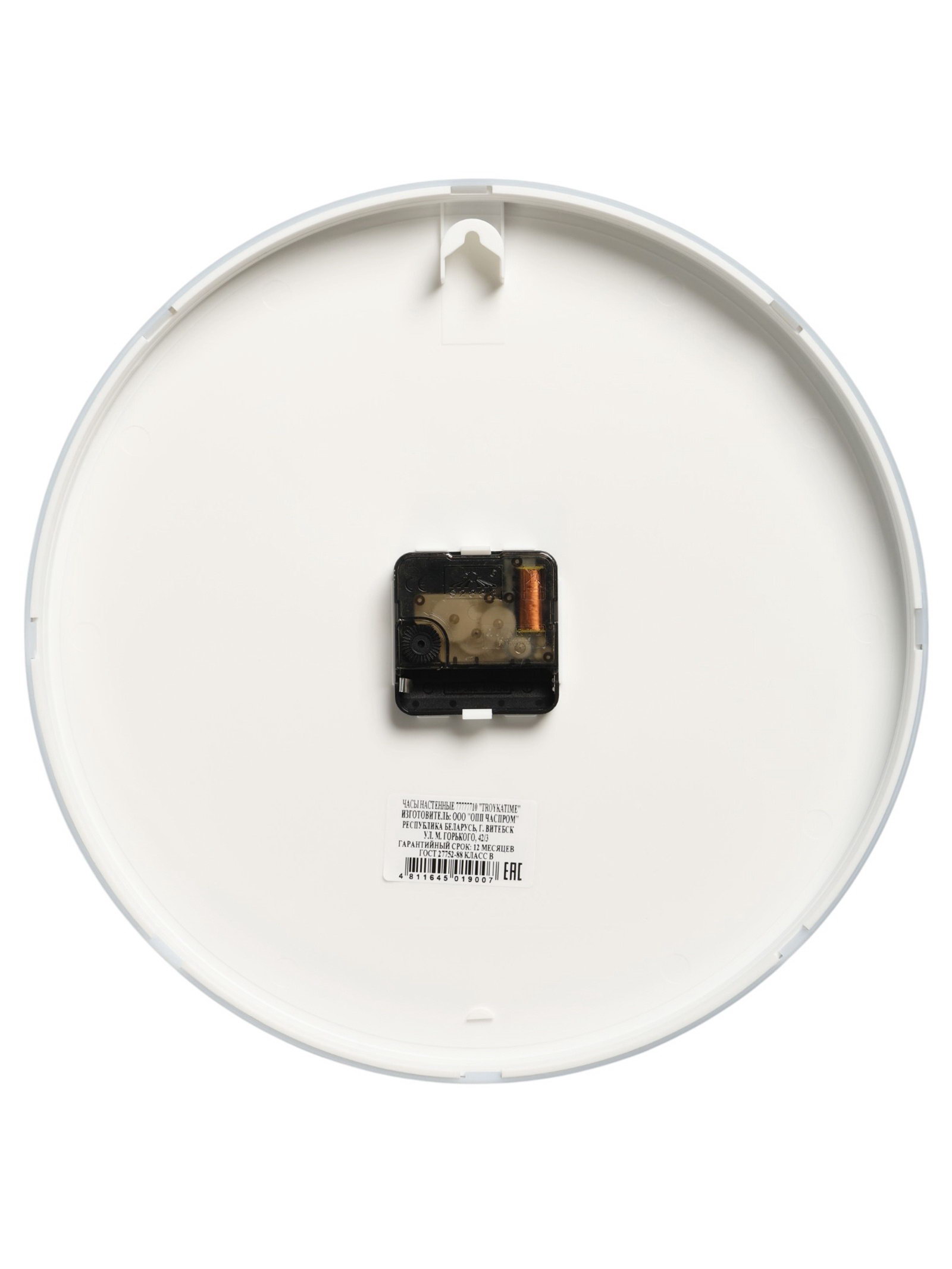 Размер упаковки: 31 x 5.5 x 31 см. Цвет: Белый Форма: Круглая Ход стрелок: Плавный Бесшумные: Да tnved: 9105210000 tnved: 9105210000 Высота, см: 30 Ширина, см: 30 Тип индикации: Арабские цифры Типоразмер батареек: AA (LR6) Тип механизма: Кварцевый Цвет корпуса: Серебристый Цвет циферблата: Бежевый Особенности: