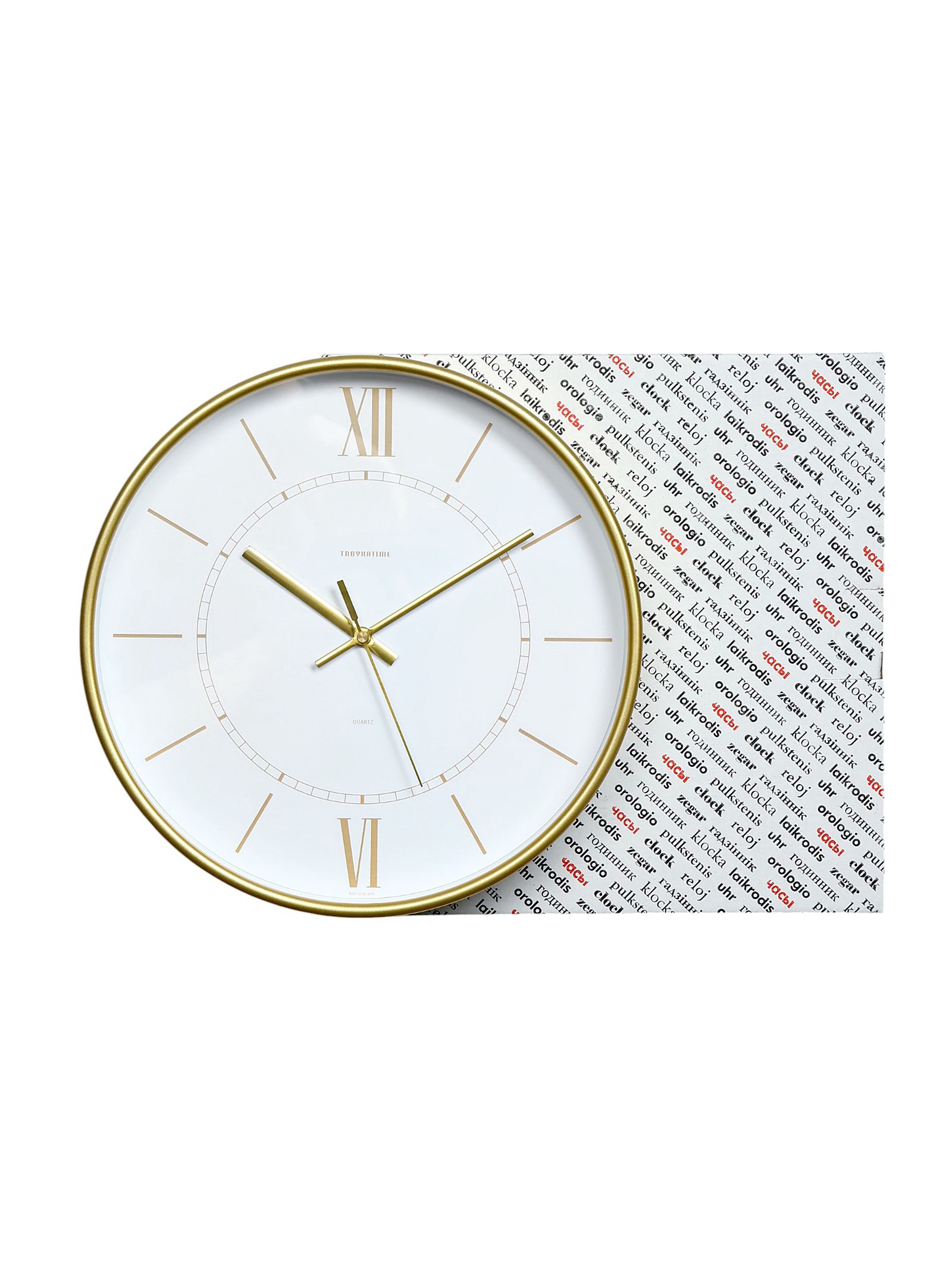 Размер упаковки: 31 x 5.5 x 31 см. Ход стрелок: Плавный Ход стрелок: Плавный tnved: 9105210000 Температурное ограничение: Нет Цвет: Белый Форма: Круглая Высота, см: 30.5 Ширина, см: 30.5 Типоразмер батареек: AA (LR6) Тип индикации: Римские цифры Тип механизма: Кварцевый Цвет циферблата: Белый Цвет корпуса: Золотистый Особенности