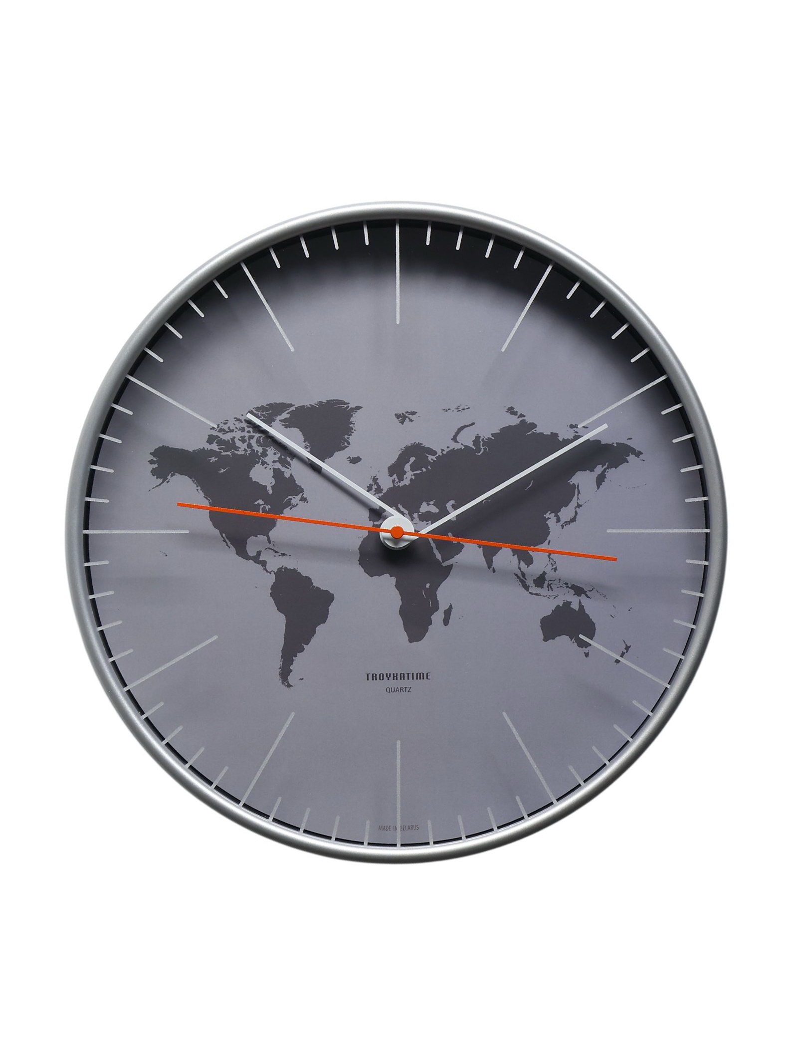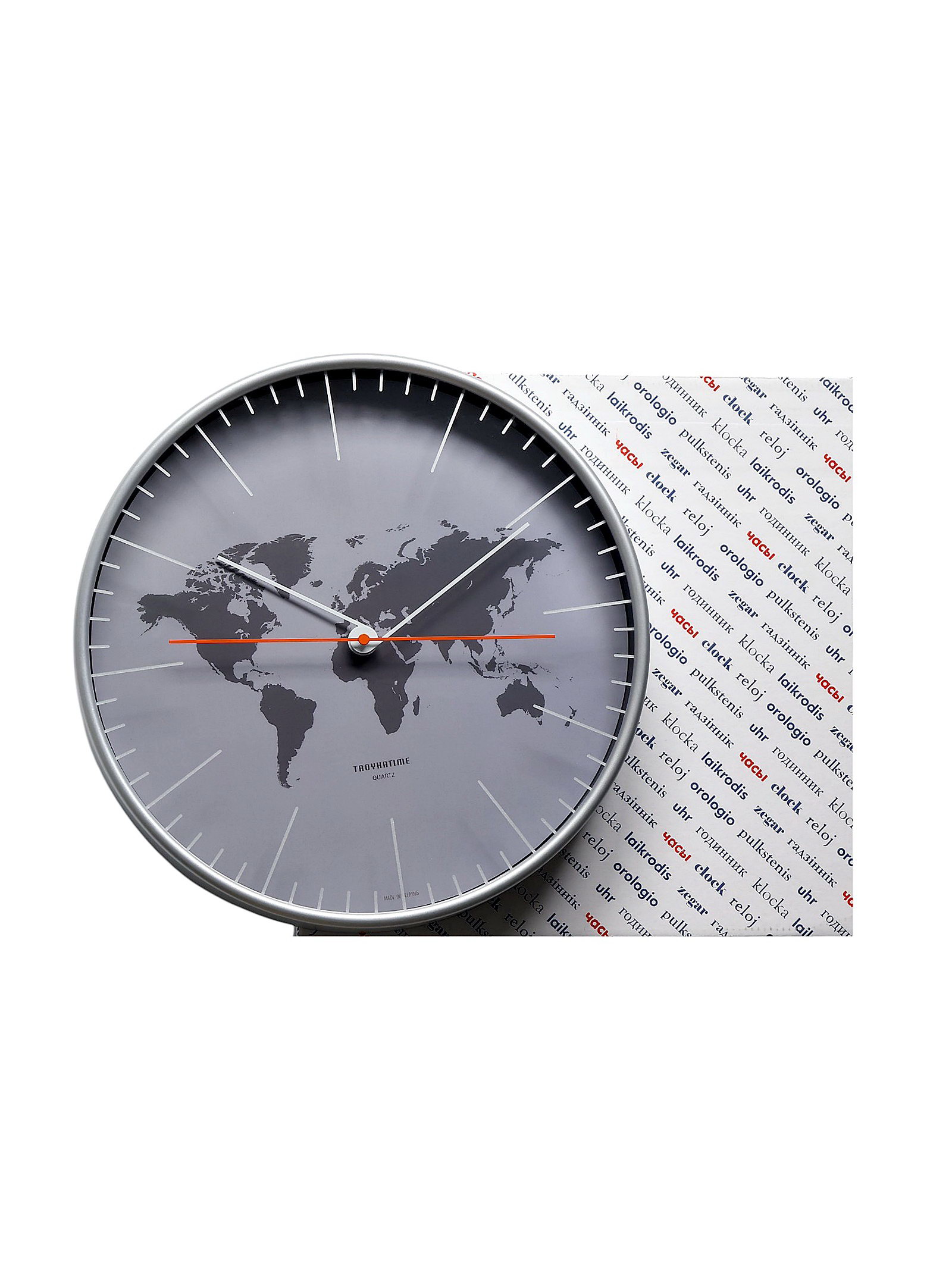 Размер упаковки: 31 x 5.5 x 31 см. Цвет циферблата: Серый Бесшумные: Да tnved: 9105210000 Температурное ограничение: Нет Форма: Круглая Тематика: Карта мира Высота, см: 30.5 Ширина, см: 30.5 Тип индикации: Отметки Ход стрелок: Плавный Типоразмер батареек: AA (LR6) Тип механизма: Кварцевый Цвет корпуса: Серый