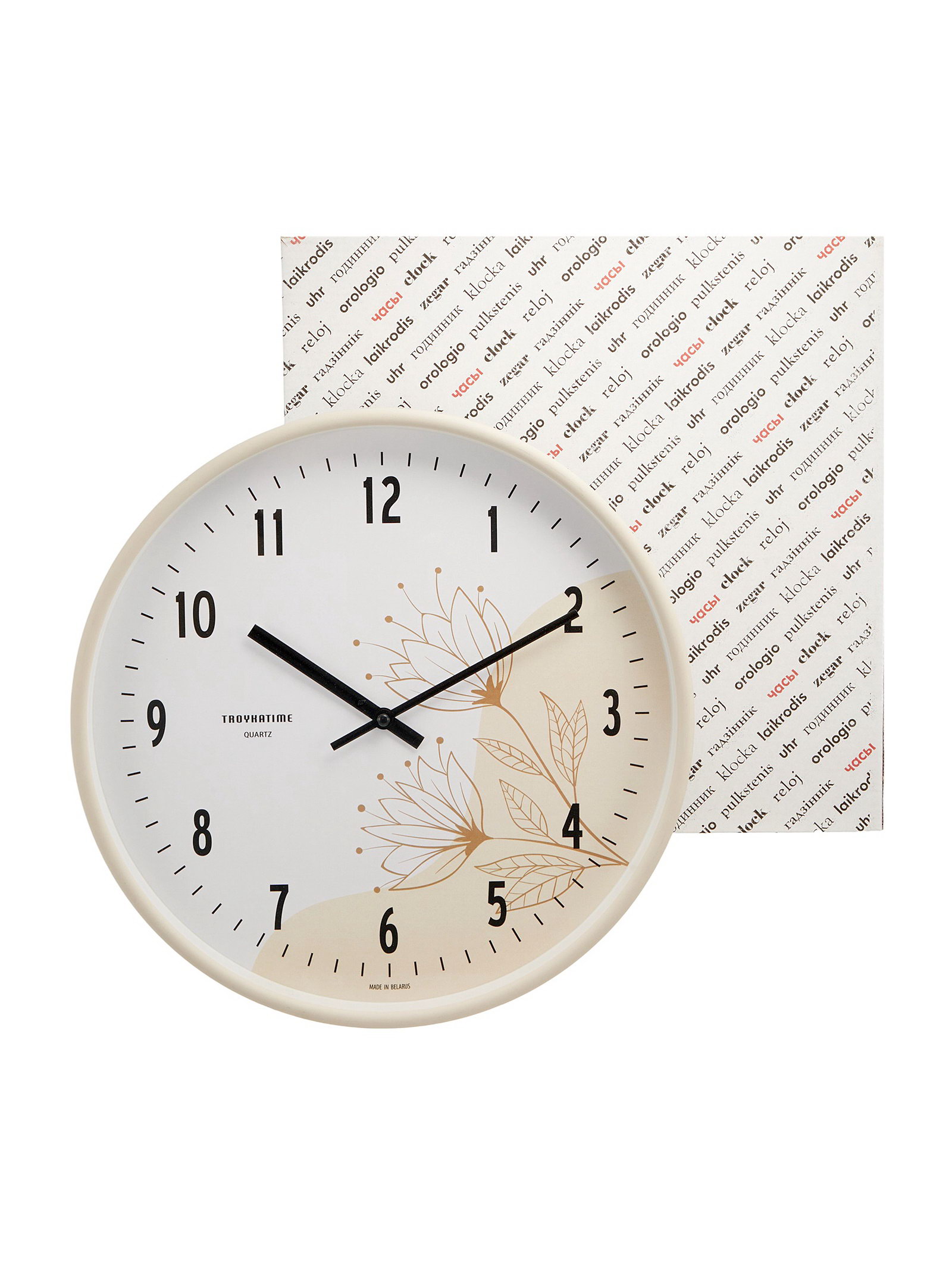 Размер упаковки: 31 x 6 x 31 см. Тип индикации: Арабские цифры Цвет циферблата: Белый Ход стрелок: Плавный Бесшумные: Да tnved: 9105210000 Температурное ограничение: Нет Форма: Круглая Тип механизма: Кварцевый Ширина, см: 30.5 Высота, см: 30.5 Тематика: Цветочно-растительная Цвет корпуса: Бежевый | ||