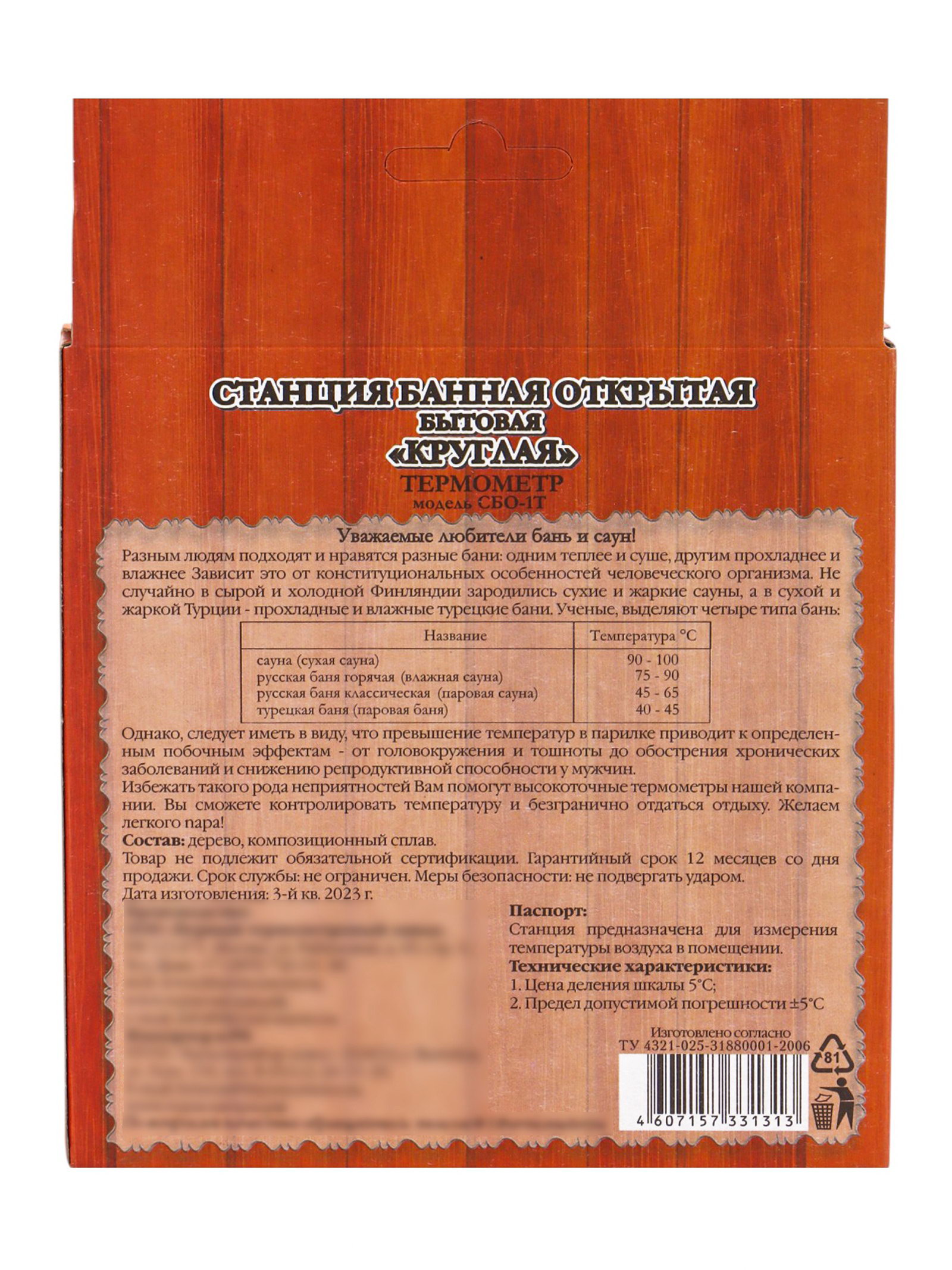 Размер упаковки: 13 x 2.5 x 13 см. Тип: Термометр Тип: Термометр tnved: 9025198000 Назначение: Для бани Жидкостный: Нет Вид: Термометр Материал корпуса: Дерево Чтобы парение в бане благотворно влияло на кожу и весь организм в целом, контролируйте температуру и уровень влажности. Опытные банщики чувствуют, когда температура в комнате перестаёт быть комфортной, и вовремя останавливают подачу пара, но новичку отслеживать этот показатель сложно. Полагаясь на измерительный прибор, вы всегда будете знать, когда следует подложить дров в каменку и поддать пару. Оптимальная температура для парилки в русской бане составляет 60–70 °C при влажности 70–90 %. | ||