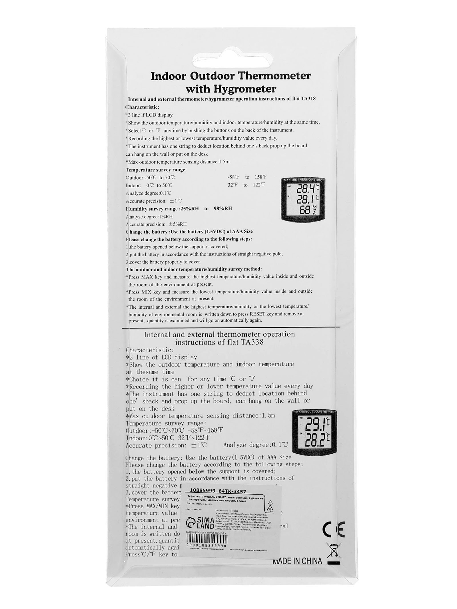 Термометр LTR-07, электронный, 2 датчика температуры, датчик влажности, белый, 7x12.5x1.8 см., Китай
