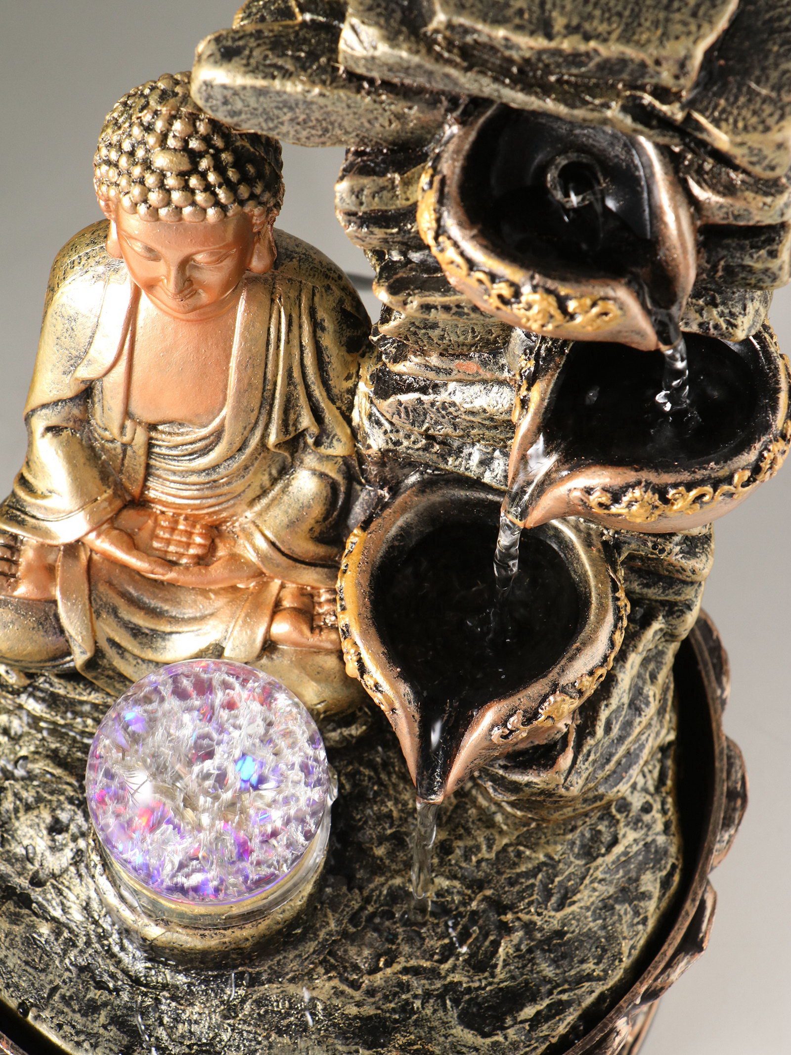 Фонтан настольный полистоун 220 В "Будда у скалы с чашами", от сети, 30x21x21 см, 21x21x30 см., Китай