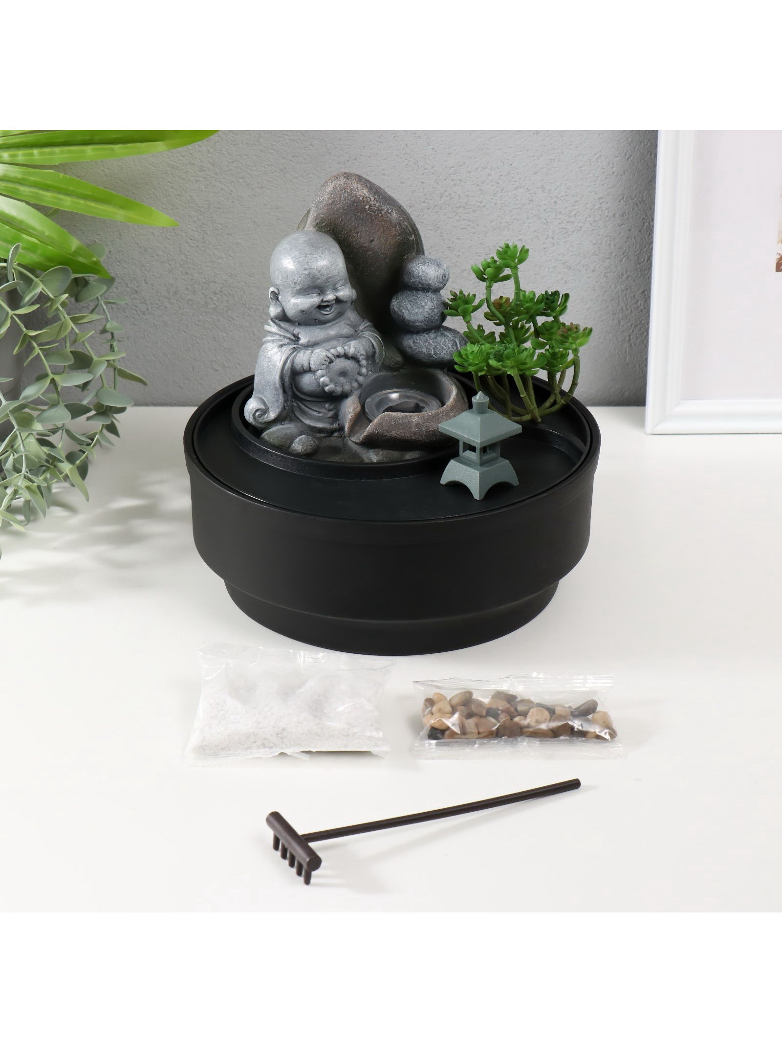 Фонтан настольный, японский сад камней "Маленький хотей в саду Дзен", от сети с подсветкой, 21x21x21 см, 21x21x21 см., Китай