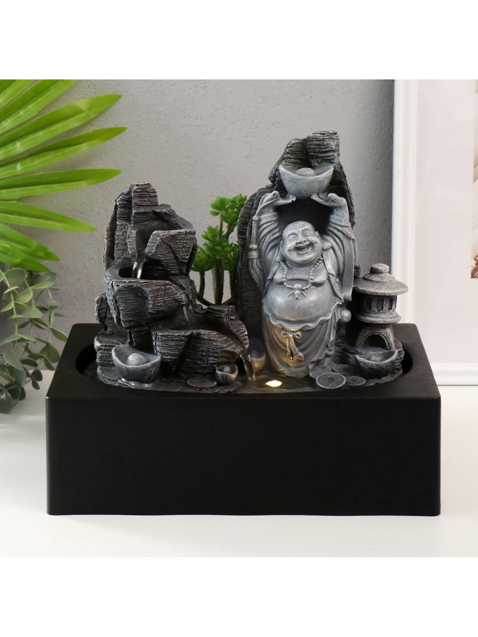 Фонтан настольный с подсветкой "Хотей со слитком в каменном городе", от сети, 29x21x26 см, 21x29x26 см., Китай