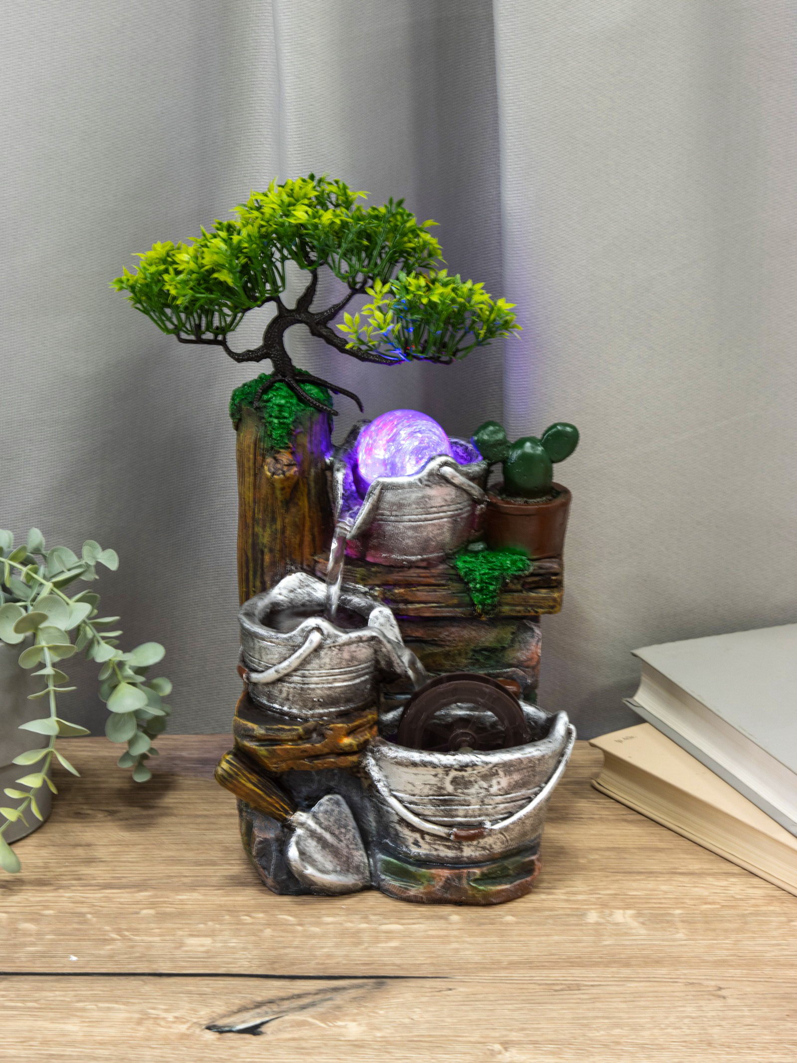 Размер упаковки: 20 x 32 x 23 см. tnved: 3926400000 Тематика: Классика Подсветка: Да Этот декоративный фонтан "Ведёрки под деревом" создание для тех, кто ищет гармонию и спокойствие в каждом уголке своего дома. Его изысканный дизайн с природными мотивами напоминает о лесной тропинке, затерянной вдали от бурного мира. Размером всего в 32х15х13 см, он компактно впишется в любое пространство, принося нотку умиротворения. Основные преимущества