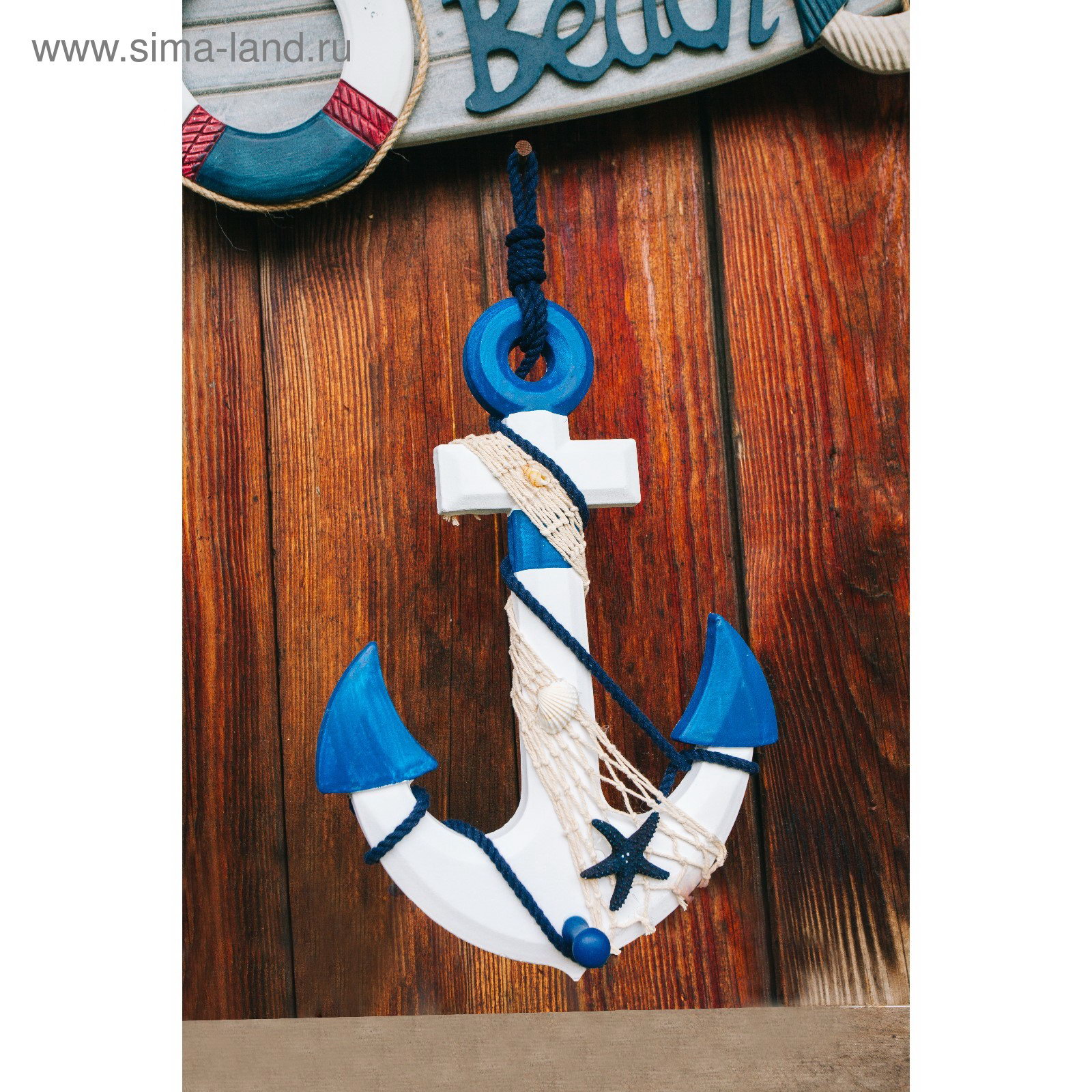 Декор настенный, панно с вешалкой "Якорь интерьерный с веревкой и звездой", бело-синий, 5x23x32 см, 23x5x32 см., Китай
