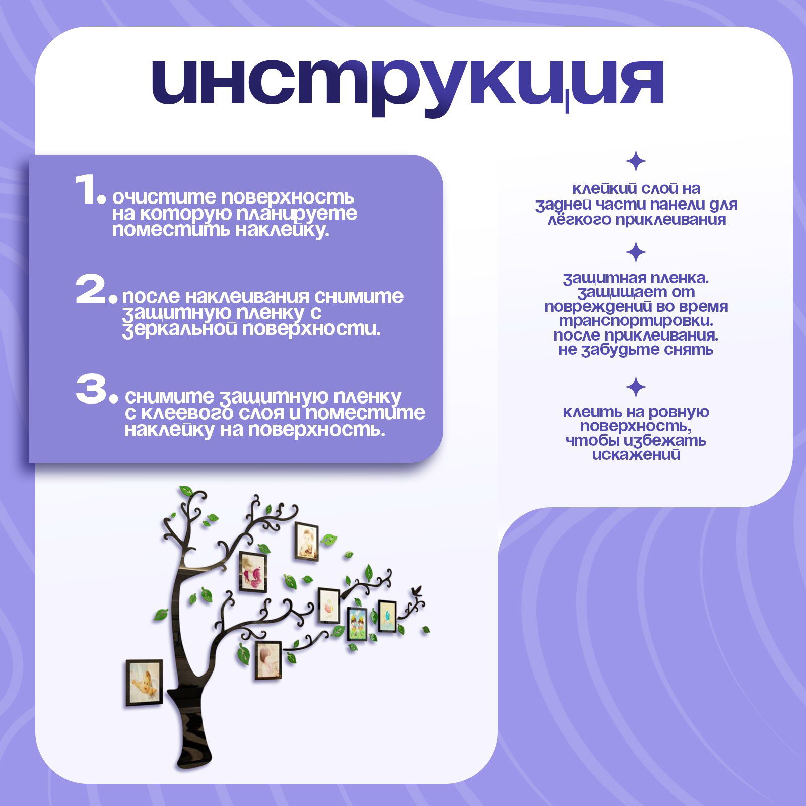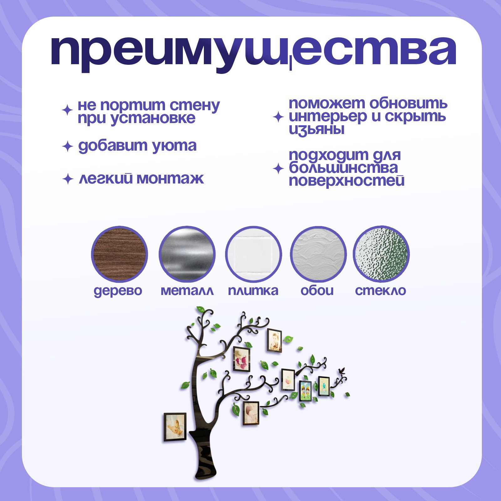 Цвет: Зелёный, Чёрный Вид наклейки: Интерьерная, С фоторамкой Размер упаковки: 16.3 x 3.5 x 27.3 см. Вид крепежа: Двусторонняя клейкая лента tnved: 3926400000 tnved: 3926400000 Тематика: Дерево Высота, см: 110 Ширина, см: 140 Тематика праздника: День семьи Количество фотографий: 7 Форма под фото: Прямоугольник Настенные наклейки изготовлены из высококачественного акрила. Это долговечный, безопасный, влагостойкий и неприхотливый в уходе материал. Наклейки подходят для декора интерьера дома, офиса, магазина. Их используют, чтобы освежить или дополнить интерьер, скрыть дефекты на стене, в качестве безопасной и оригинальной альтернативы зеркалу. Изделие легко крепится на любой чистой, сухой, гладкой поверхности. Например, на окрашенной или оклеенной обоями стене, стекле, керамической плитке, металле, пластике. Наклейки легко снимаются и не оставляют следов, поэтому их удобно часто менять или использовать в съёмной квартире. Нанесение на поверхность