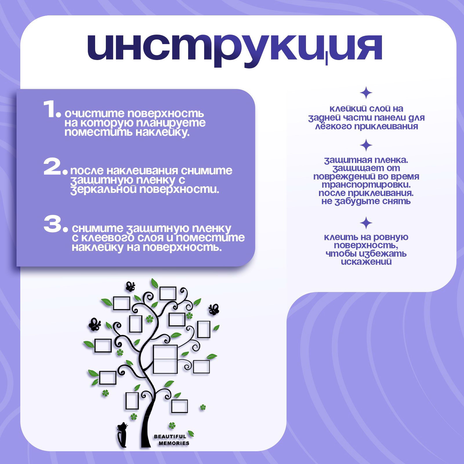 Цвет: Зелёный, Чёрный Вид наклейки: Интерьерная, С фоторамкой Размер упаковки: 16.5 x 3.7 x 27.5 см. Вид крепежа: Двусторонняя клейкая лента tnved: 3926400000 tnved: 3926400000 Тематика: Дерево Ширина, см: 106 Высота, см: 130 Тематика праздника: День семьи Количество фотографий: 11 Форма под фото: Прямоугольник Настенные наклейки изготовлены из высококачественного акрила. Это долговечный, безопасный, влагостойкий и неприхотливый в уходе материал. Наклейки подходят для декора интерьера дома, офиса, магазина. Их используют, чтобы освежить или дополнить интерьер, скрыть дефекты на стене, в качестве безопасной и оригинальной альтернативы зеркалу. Изделие легко крепится на любой чистой, сухой, гладкой поверхности. Например, на окрашенной или оклеенной обоями стене, стекле, керамической плитке, металле, пластике. Наклейки легко снимаются и не оставляют следов, поэтому их удобно часто менять или использовать в съёмной квартире. Нанесение на поверхность