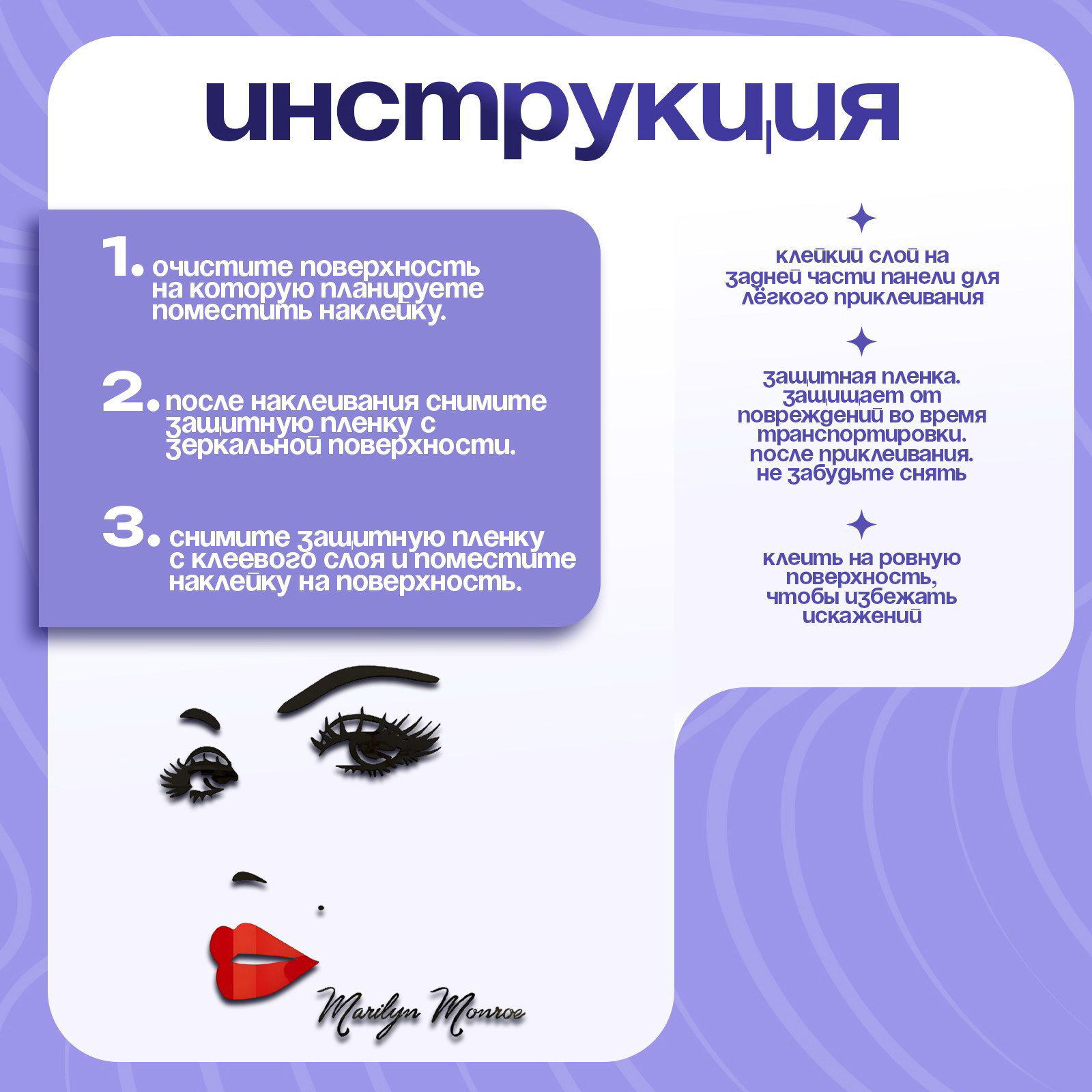 Вид наклейки: Зеркальная, Интерьерная Размер упаковки: 17 x 3.5 x 28.5 см. Размер упаковки: 17 x 3.5 x 28.5 см. tnved: 3926400000 Тематика: Люди Высота, см: 100 Ширина, см: 90 Цвет: Разноцветный Настенные наклейки изготовлены из высококачественного акрила. Это долговечный, безопасный, влагостойкий и неприхотливый в уходе материал. Наклейки подходят для декора интерьера дома, офиса, магазина. Их используют, чтобы освежить или дополнить интерьер, скрыть дефекты на стене, в качестве безопасной и оригинальной альтернативы зеркалу. Изделие легко крепится на любой чистой, сухой, гладкой поверхности. Например, на окрашенной или оклеенной обоями стене, стекле, керамической плитке, металле, пластике. Наклейки легко снимаются и не оставляют следов, поэтому их удобно часто менять или использовать в съёмной квартире. Нанесение на поверхность