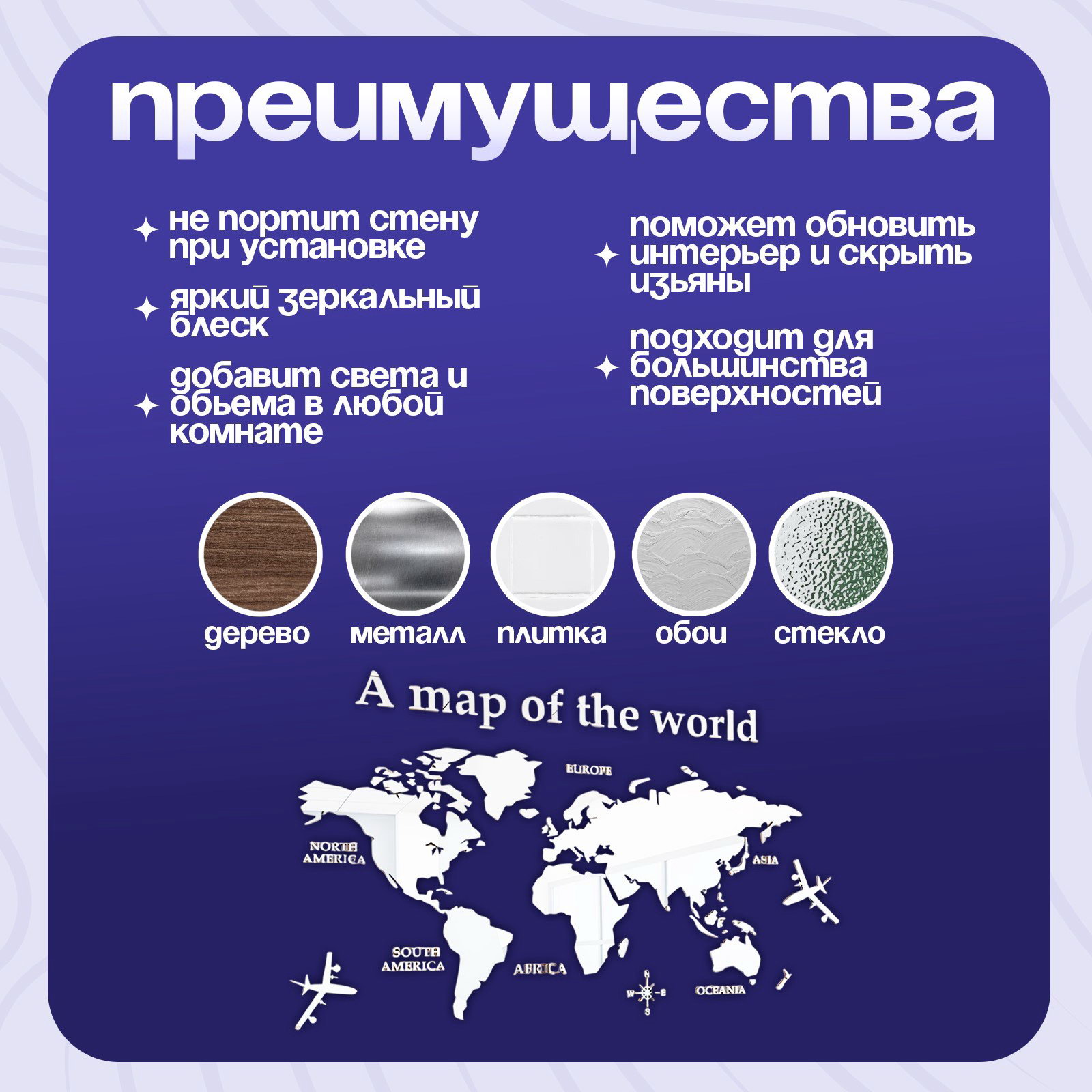 Вид наклейки: Зеркальная, Интерьерная Размер упаковки: 23 x 5 x 32.5 см. Размер упаковки: 23 x 5 x 32.5 см. tnved: 3926400000 Тематика: Карта мира Ширина, см: 180 Высота, см: 100 Цвет: Серебристый Настенные наклейки изготовлены из высококачественного акрила. Это долговечный, безопасный, влагостойкий и неприхотливый в уходе материал. Наклейки подходят для декора интерьера дома, офиса, магазина. Их используют, чтобы освежить или дополнить интерьер, скрыть дефекты на стене, в качестве безопасной и оригинальной альтернативы зеркалу. Изделие легко крепится на любой чистой, сухой, гладкой поверхности. Например, на окрашенной или оклеенной обоями стене, стекле, керамической плитке, металле, пластике. Наклейки легко снимаются и не оставляют следов, поэтому их удобно часто менять или использовать в съёмной квартире. Нанесение на поверхность