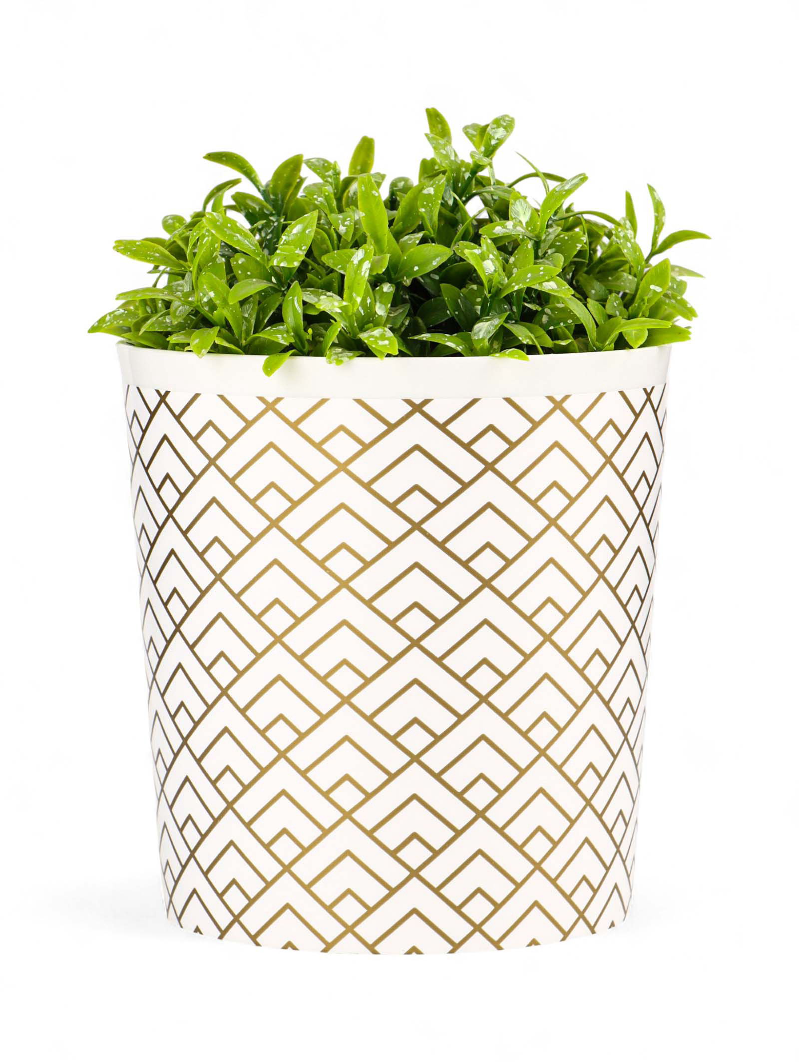 Цвет: Белый, Золотистый Размер упаковки: 14 x 14.5 x 14 см. tnved: 3924900000 Температурное ограничение: Нет Рисунок: Да Форма: Конусообразная Вид установки: Настольное Можно оставлять зимой на улице: Нет Высота, см: 15.5 Поддон в комплекте: Нет Белое кашпо с золотистым напылением это стильное настольное решение для комнатных цветов. Сочетание белой поверхности и деликатного золотого узора придаст вашему интерьеру ощущение гармонии и завершённости.