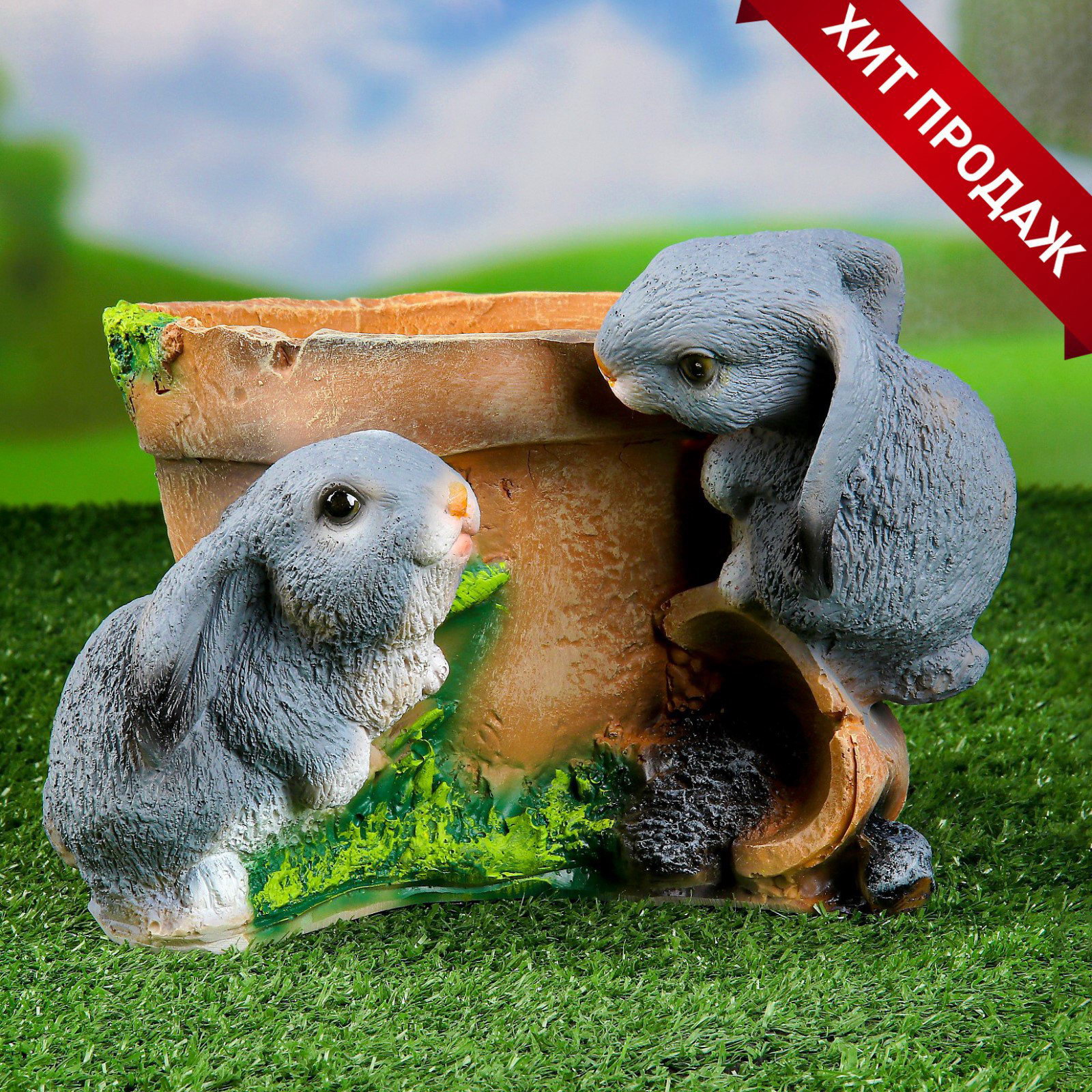 Декоративное кашпо для цветов "Зайцы у горшочка", 17 см, полистоун, 13.5 см., Хорошие сувениры, Россия