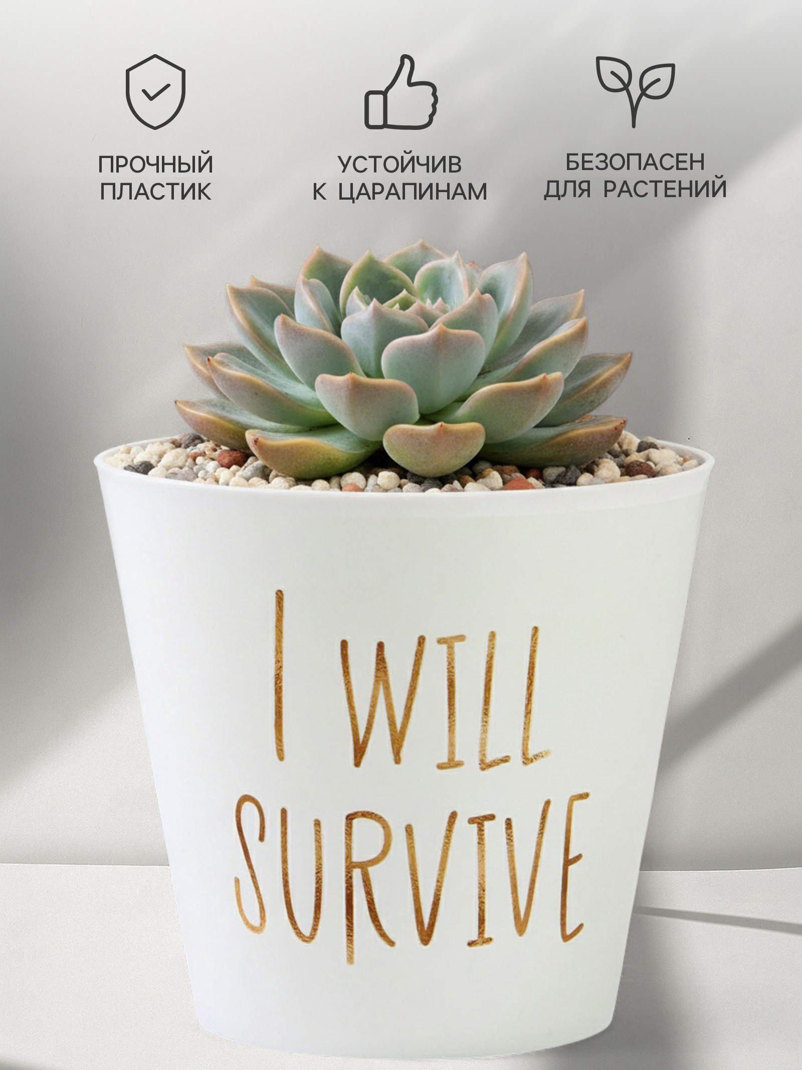 Особенности использования: кашпо выполняет декоративную функцию. Внутренний горшок с дренажным отверстием помещается внутрь это обеспечивает правильный уход за растением. "Я выживу" подходит для офисных помещений, рабочих кабинетов и личных пространств. | ||