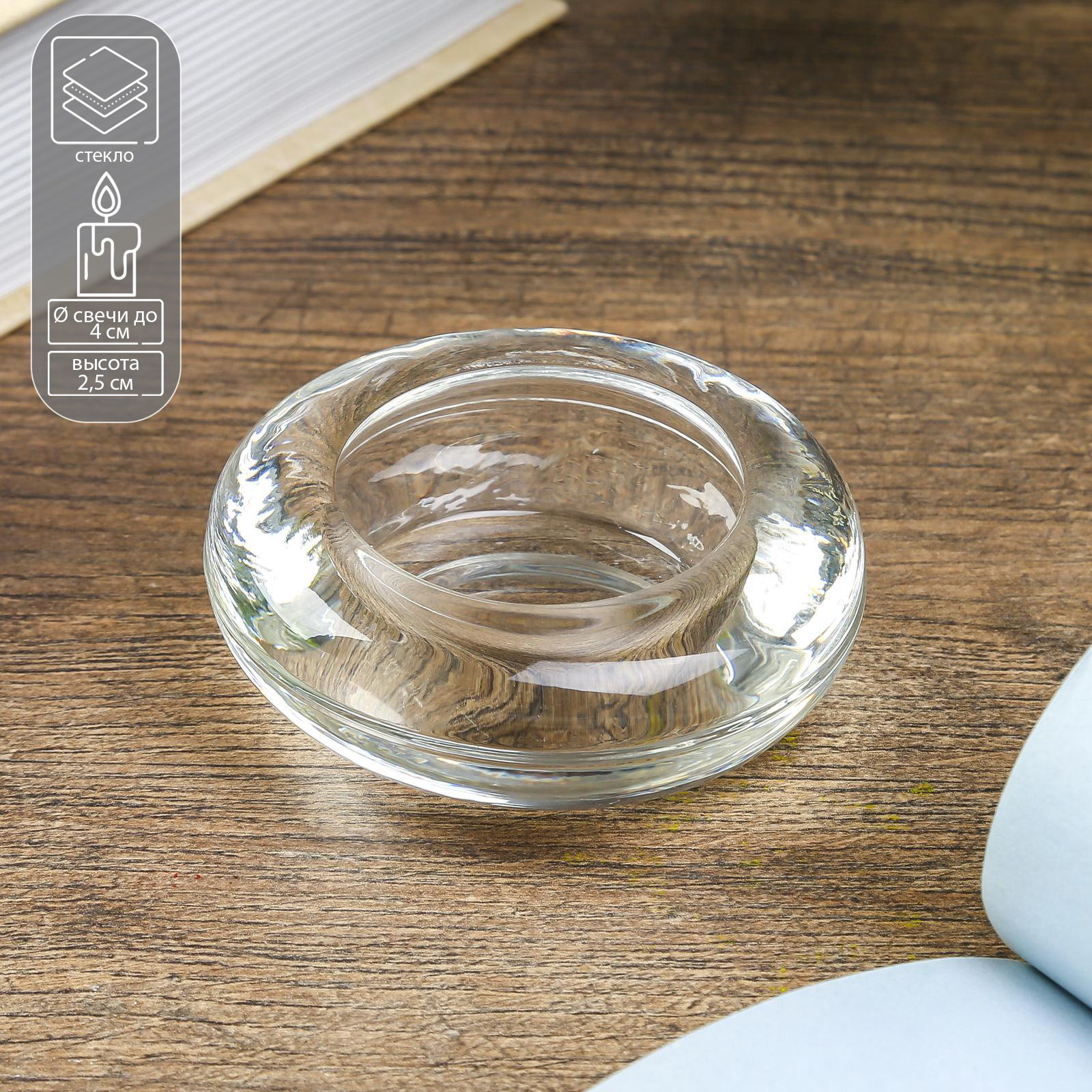 Стеклянный подсвечник на 1 свечу "Круг", прозрачный, 2.5x6.5x6.5 см, 6.5x2.5x6.5 см., Китай