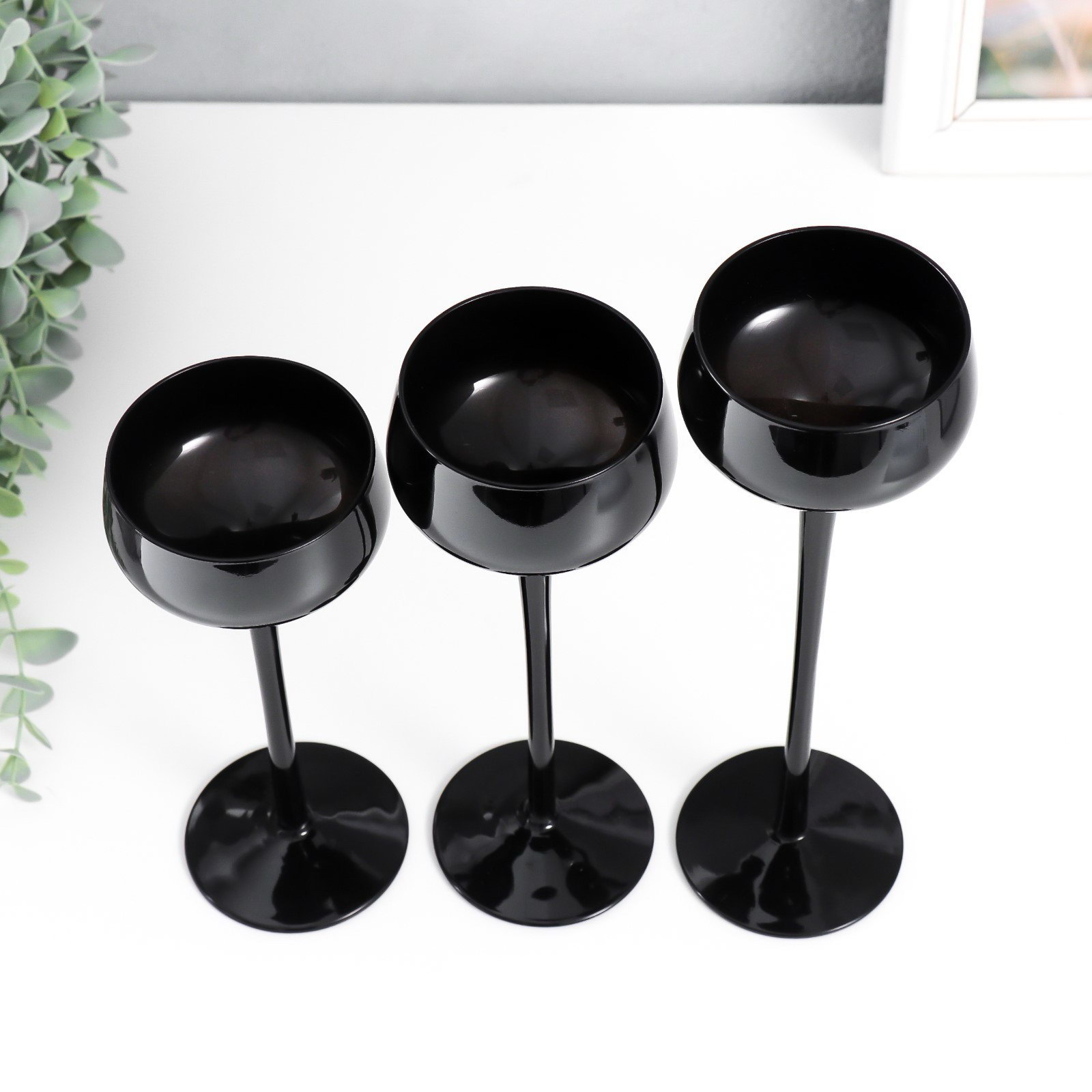 Стеклянный подсвечник на 1 свечу "Бокал-креманка", набор 3 шт., чёрный, h= 20 см, 23 см, 26x12x12 см, 12x12x24.5 см., Китай