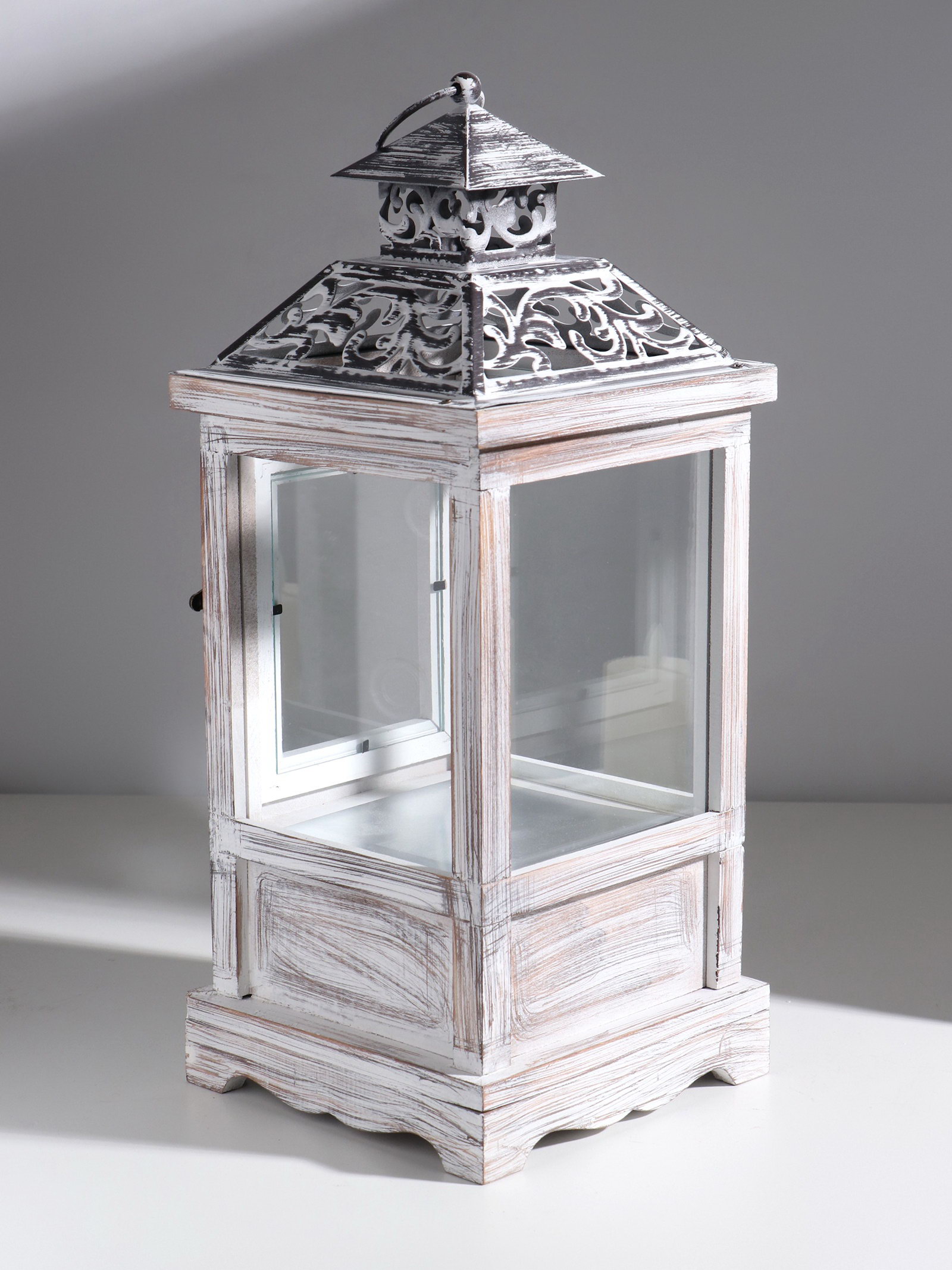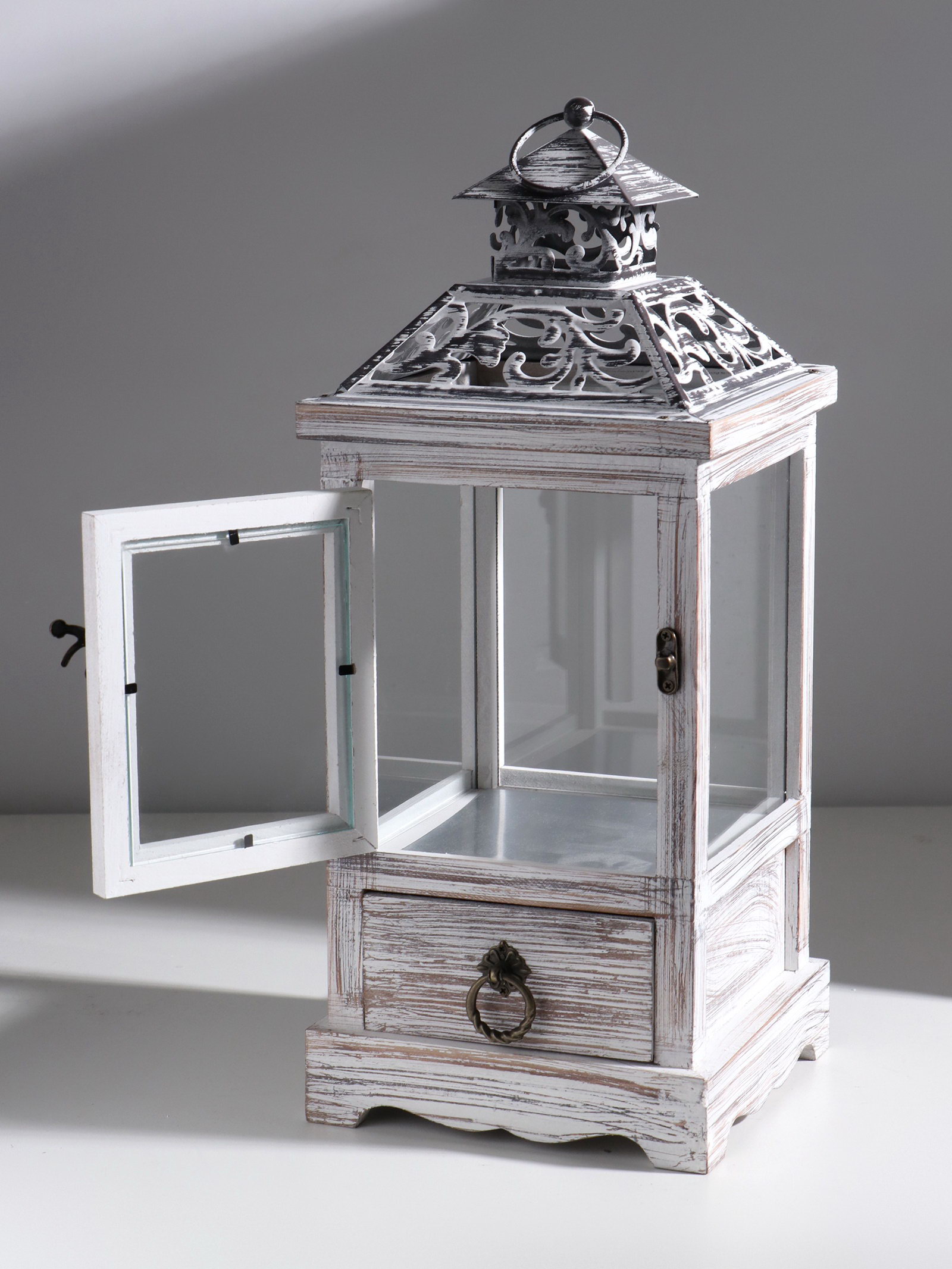 Деревянный подсвечник-фонарь на 1 свечу "С узорами на крыше", с ящиком, беж, 46x18x18 см, 18x18x43 см., Китай