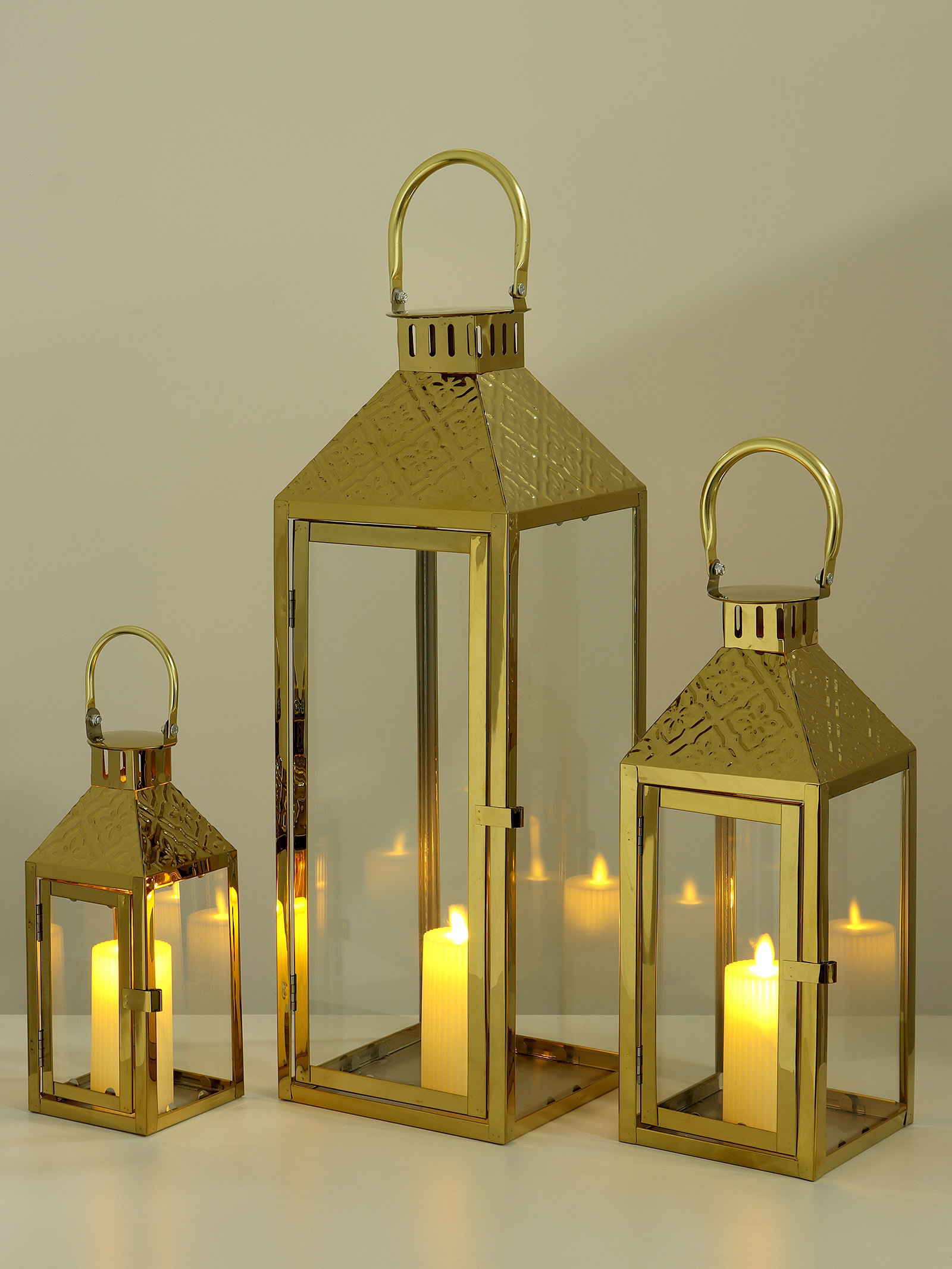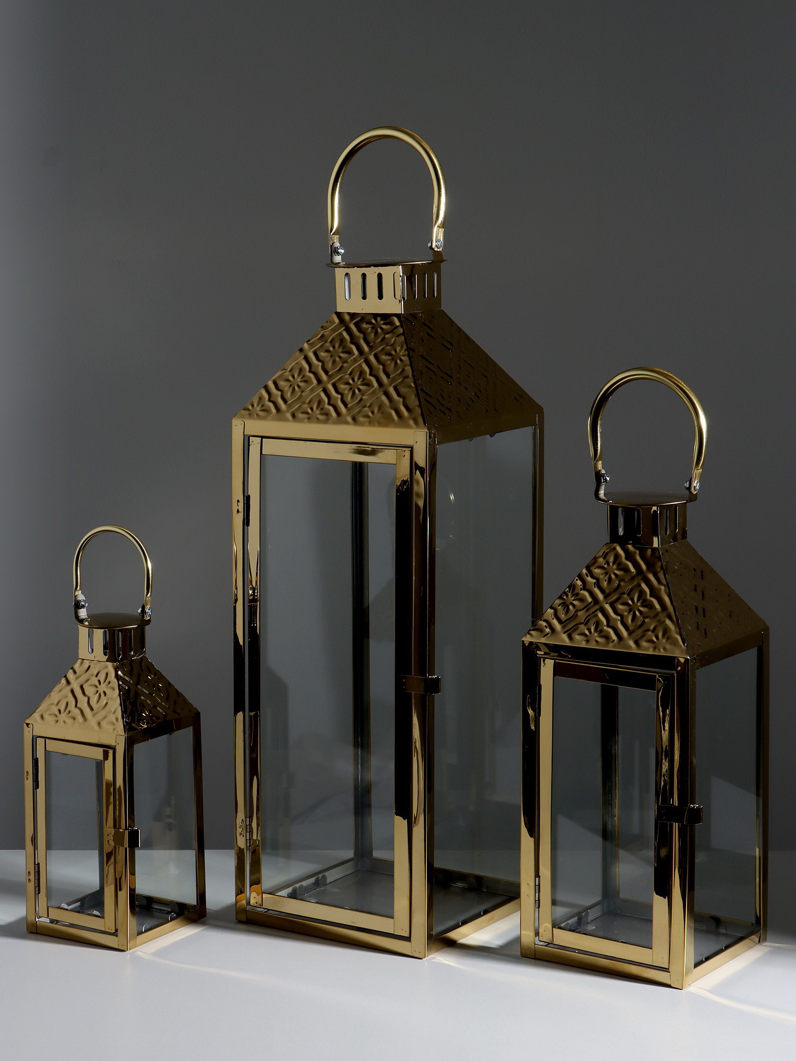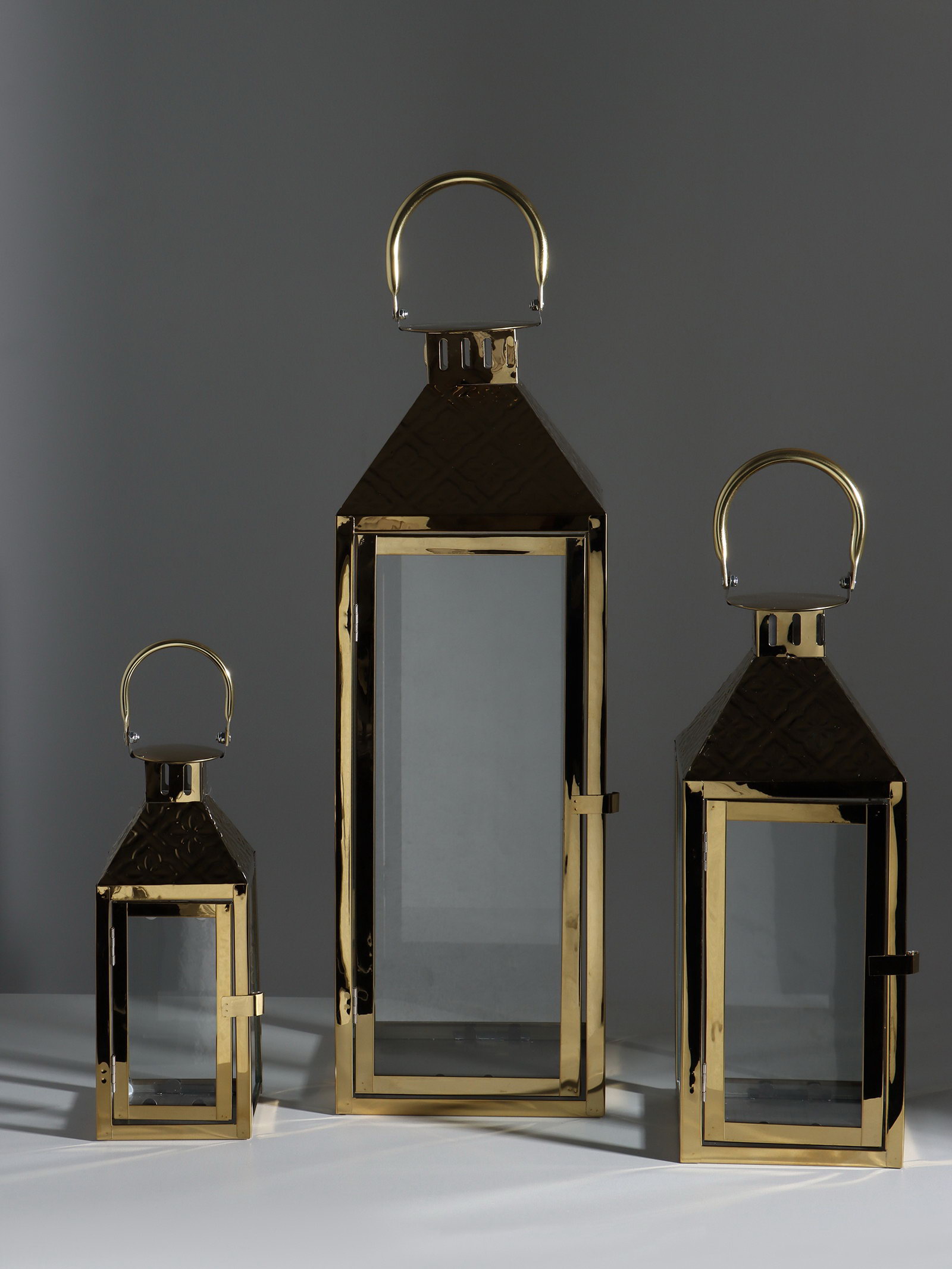 Подсвечник-фонарь на 1 свечу "Ромбы", золото, набор 3 шт., 55x18x18 см; 37.5x14.5x14.5 см; 26x10x10 см, 18x18x55 см., Китай