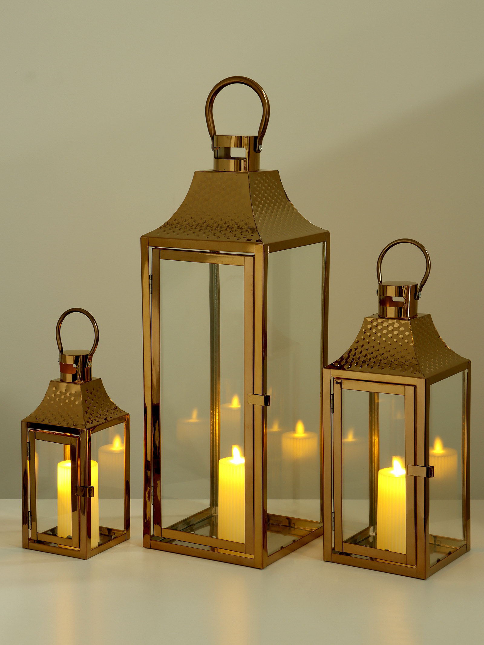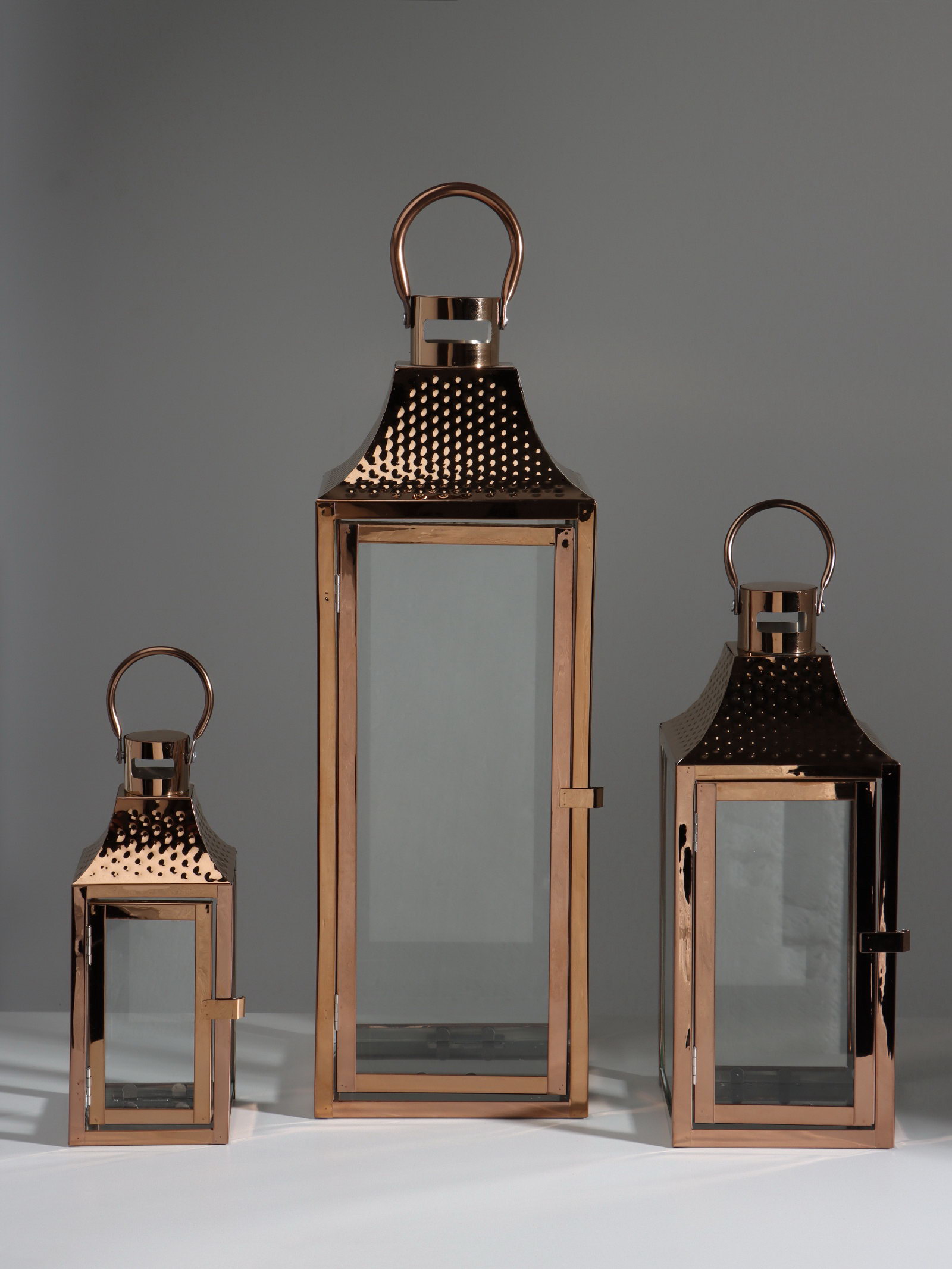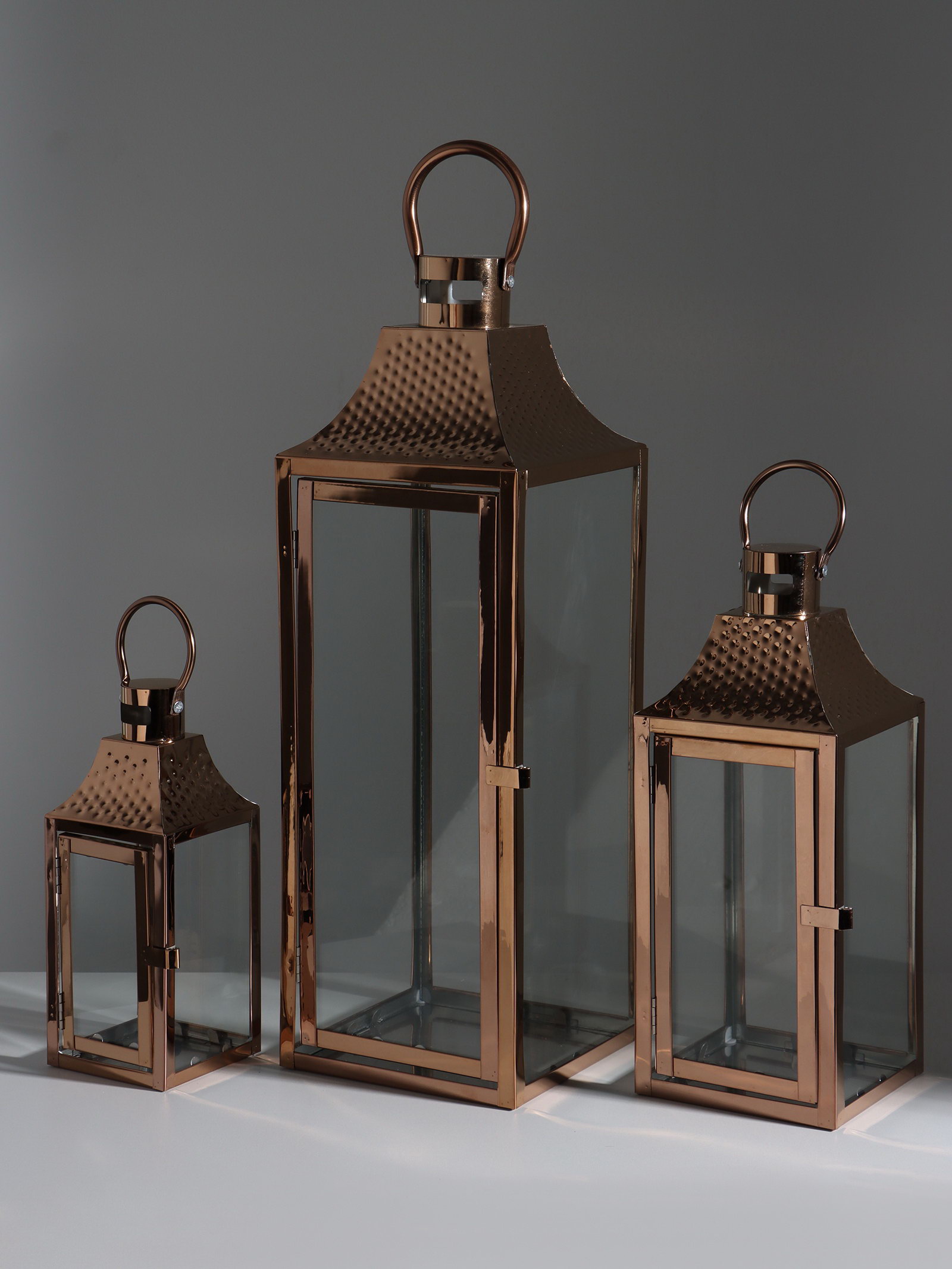 Подсвечник-фонарь на 1 свечу "Точки", медь, набор 3 шт., 55x18x18 см; 37.5x14.5x14.5 см; 26x10x10 см, 18x18x55 см., Китай