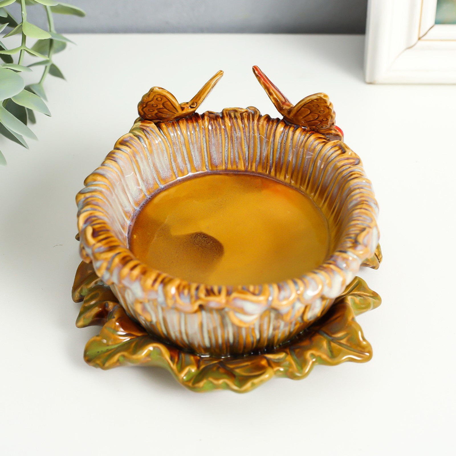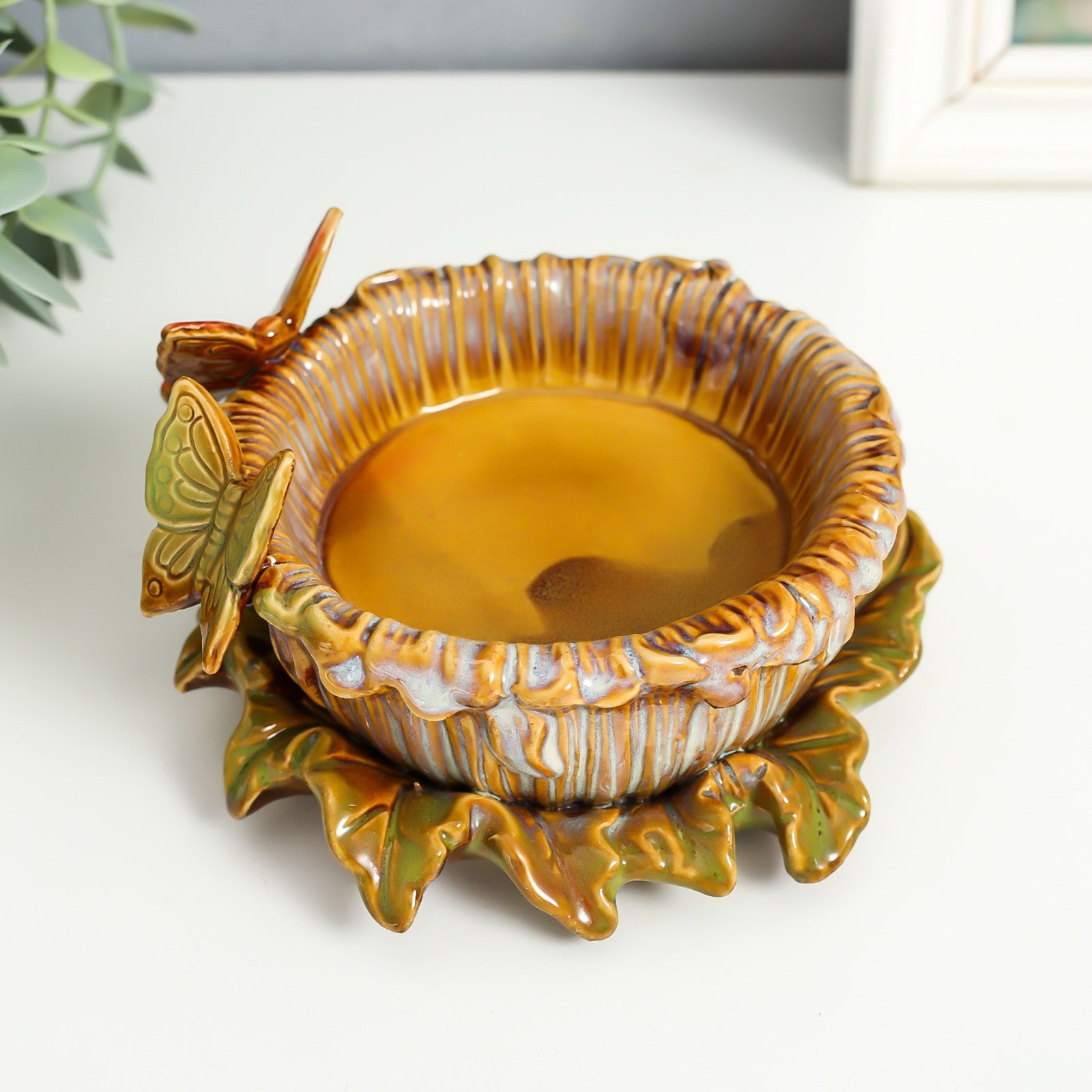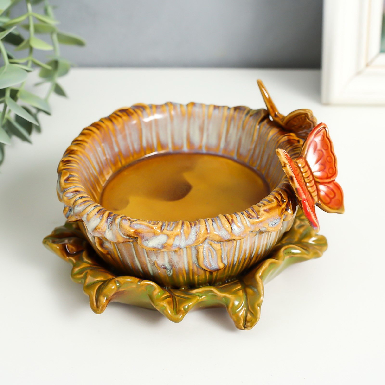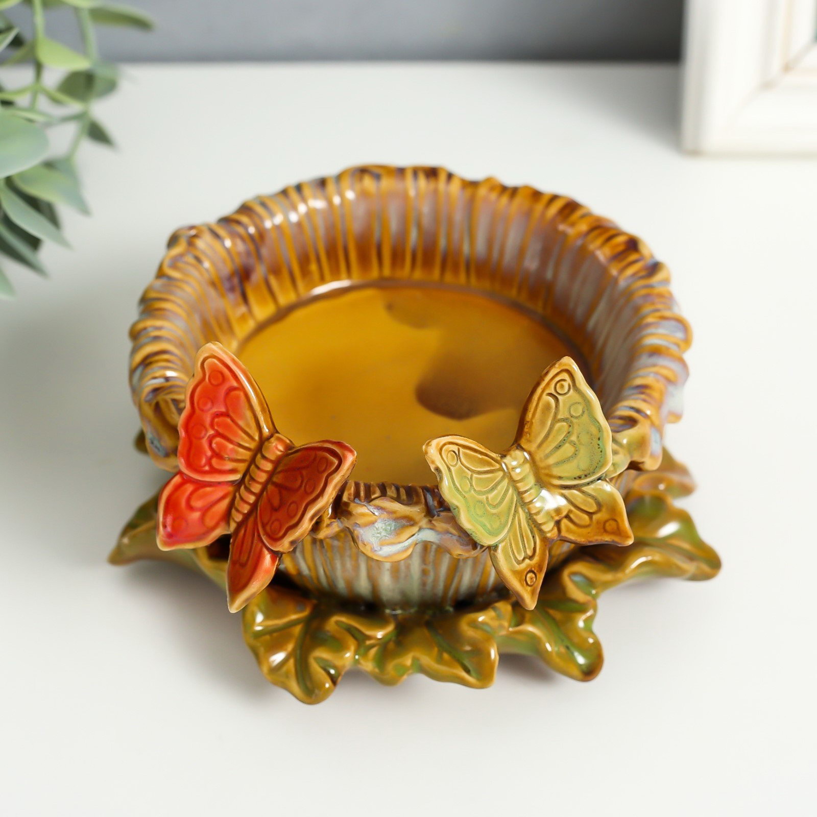 Подсвечник керамика на 1 свечу "Бабочки на цветке" d-8 см 14х14х8 см, 14x14x8 см., Китай