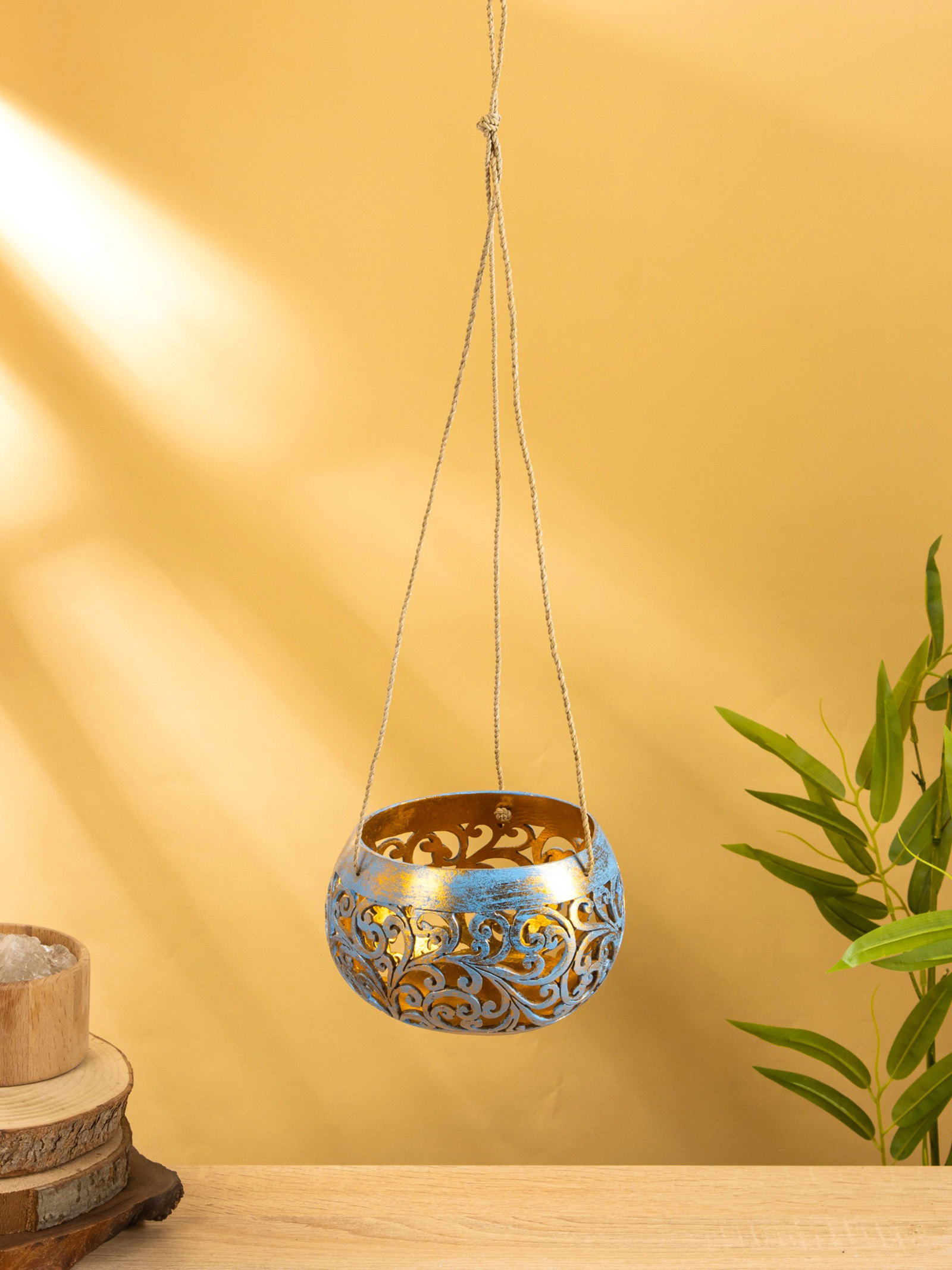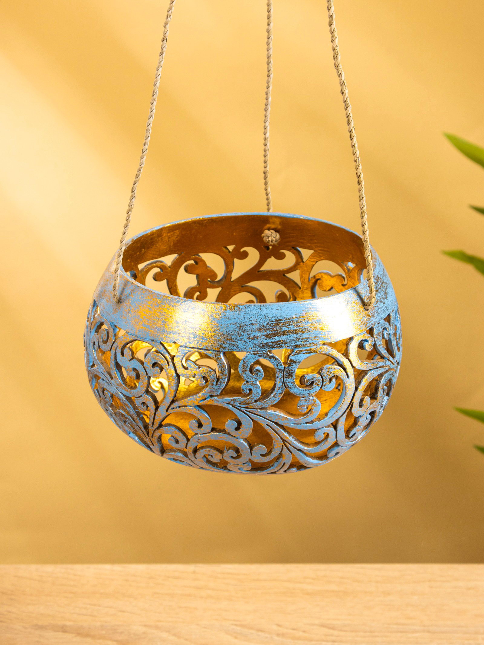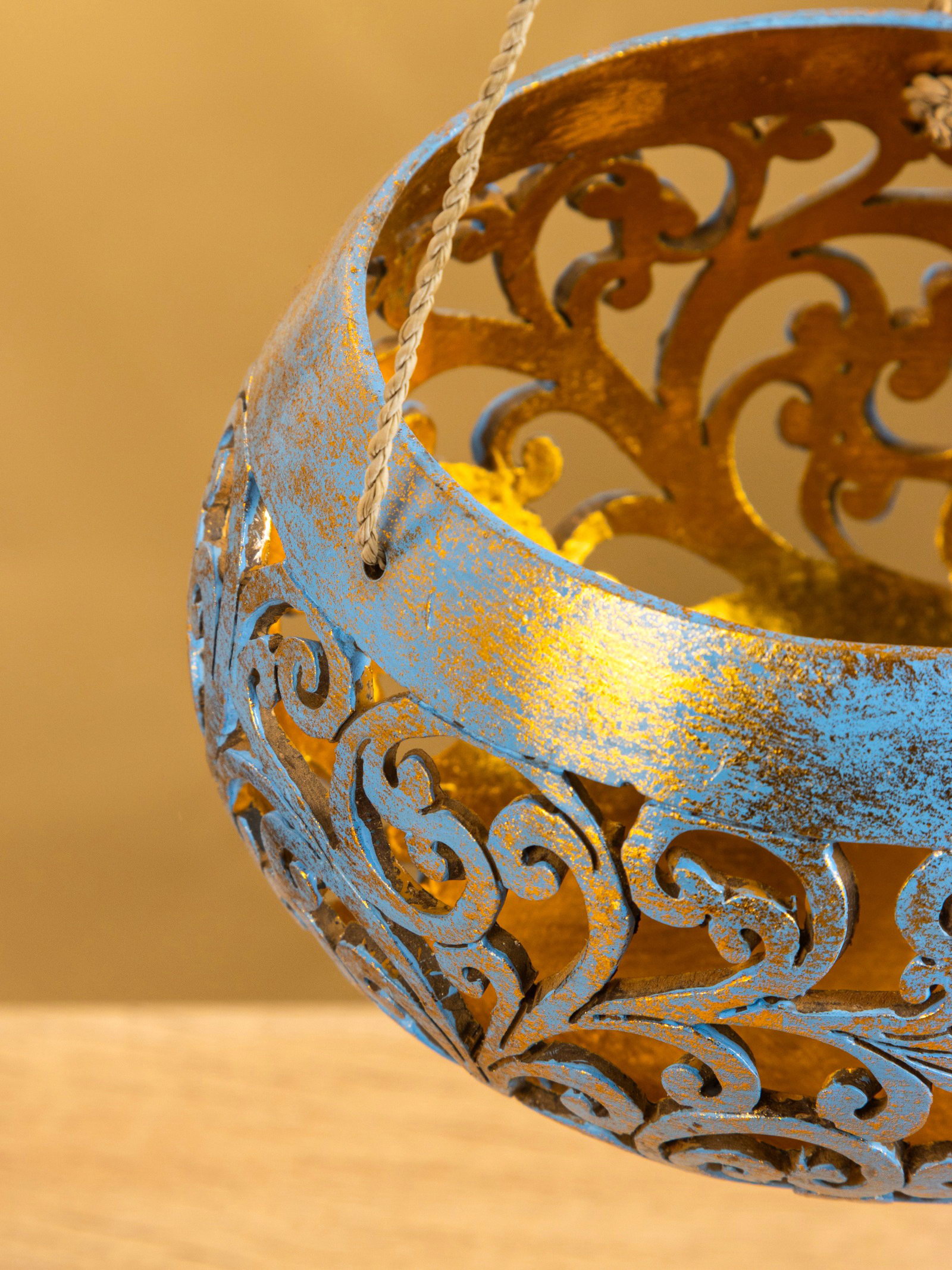 Подсвечник подвесной из кокоса, 14x14x10 см, голубой-золотой, 14x14x10 см., Индонезия
